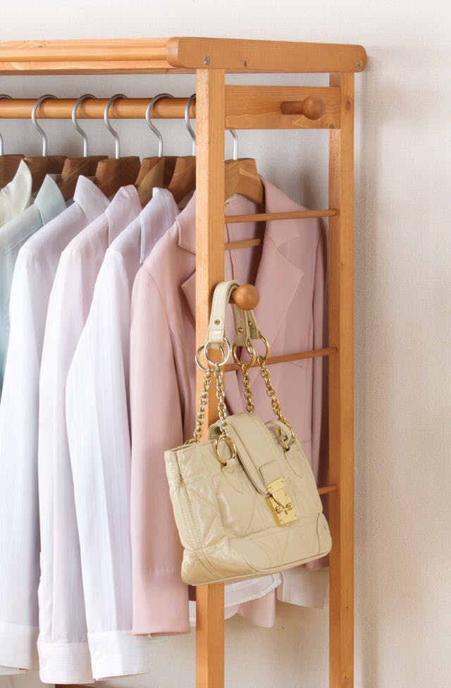 ワンピースなど丈の長い物も掛けられる天然木のカーテン付きハンガー。●シンプルなデザインなので使う場所を選びません。●サイドにはバッグなどを掛けるのに便利なフック付き(4ヶ所)。●上下の棚には小物が置けます。●移動に便利なキャスター付き。●キャスター付き●お客様組立式