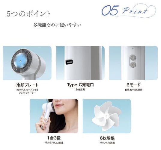 プレート部分はスイッチのONで約10℃に冷却されます。涼しい風になるだけでなく、肌に当ててどこでも冷やせる!