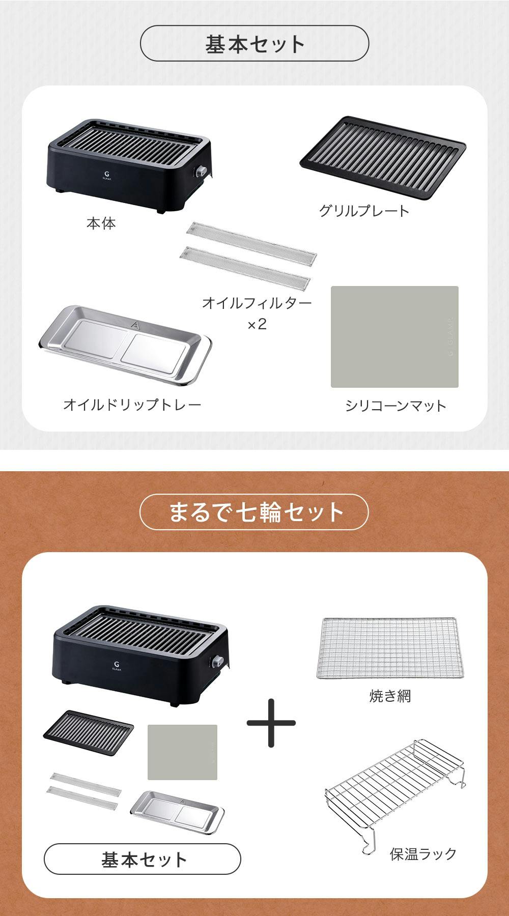 ○ 基本セット 本体、グリルプレート、オイルフィルター×2、オイルドリップトレー、シリコーンマット、取扱説明書(保証書) ○ まるで七輪セット 基本セット+焼き網、保温ラック
