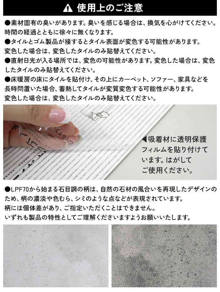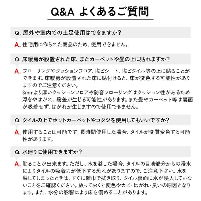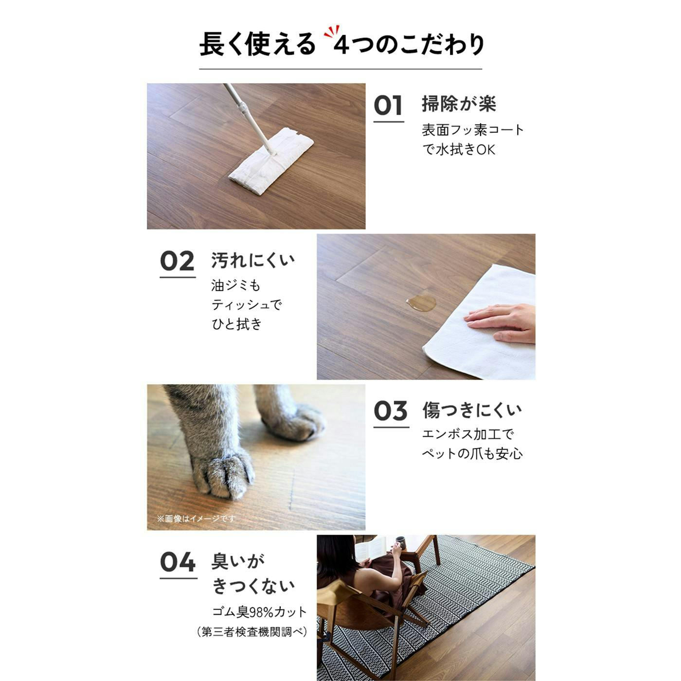【簡単に使える3つの特徴】○簡単施工:カッターで切って、置いて押すだけ。○賃貸OK:のり不使用のためはがし跡がつきにくい。○貼ってはがせる:気分転換・部分交換自在!【長く使える4つのこだわり】○掃除が楽:表面フッ素コートで水拭きOK。○汚れにくい:油ジミもティッシュでひと拭き。○傷つきにくい:エンボス加工でペットの爪も安心。○臭いがきつくない:ゴム臭98%カット(第三者検査機関調べ)