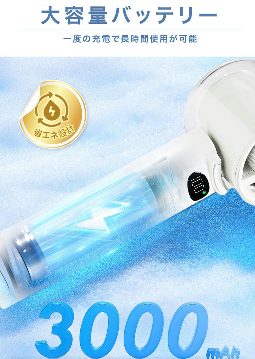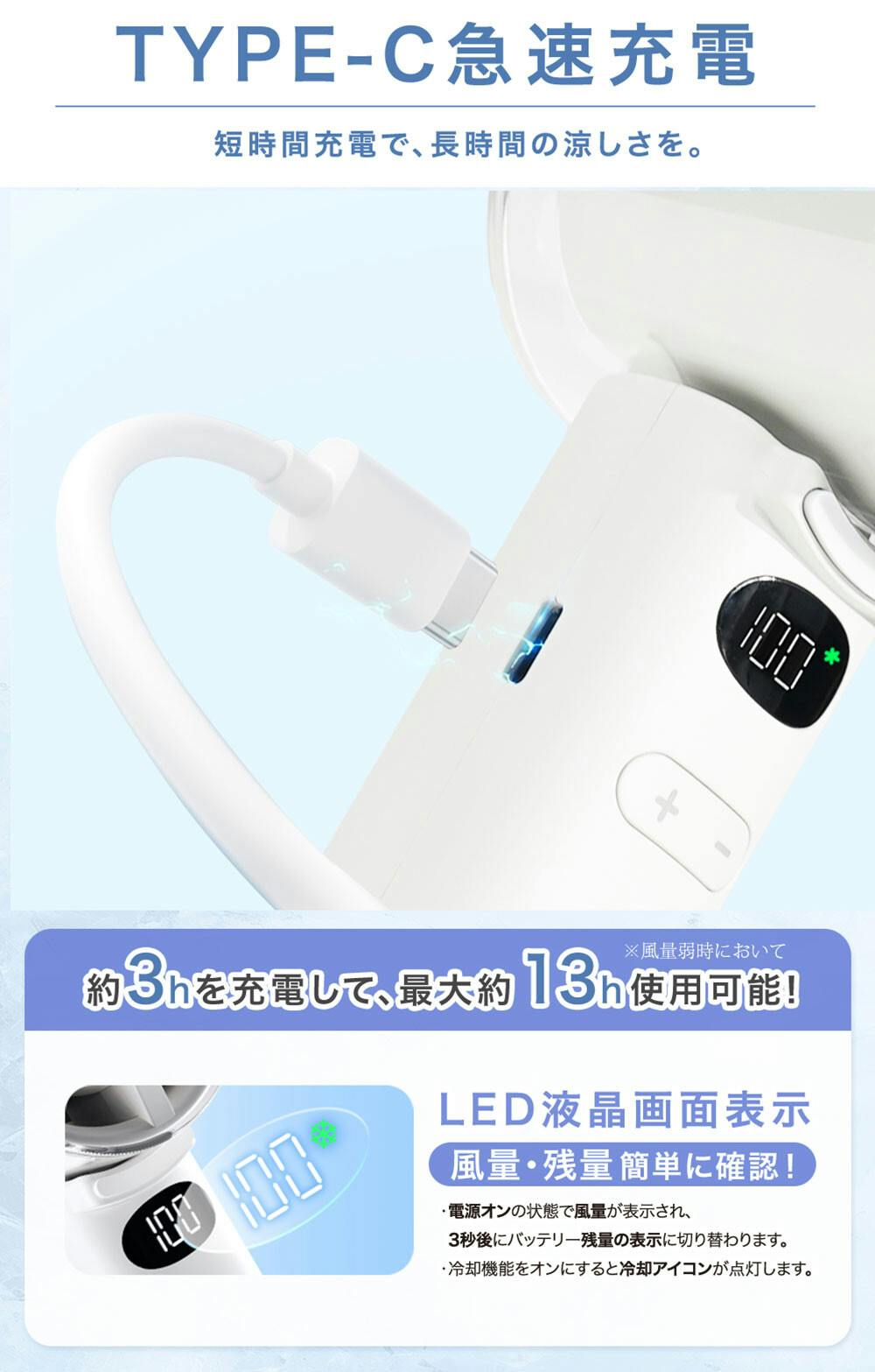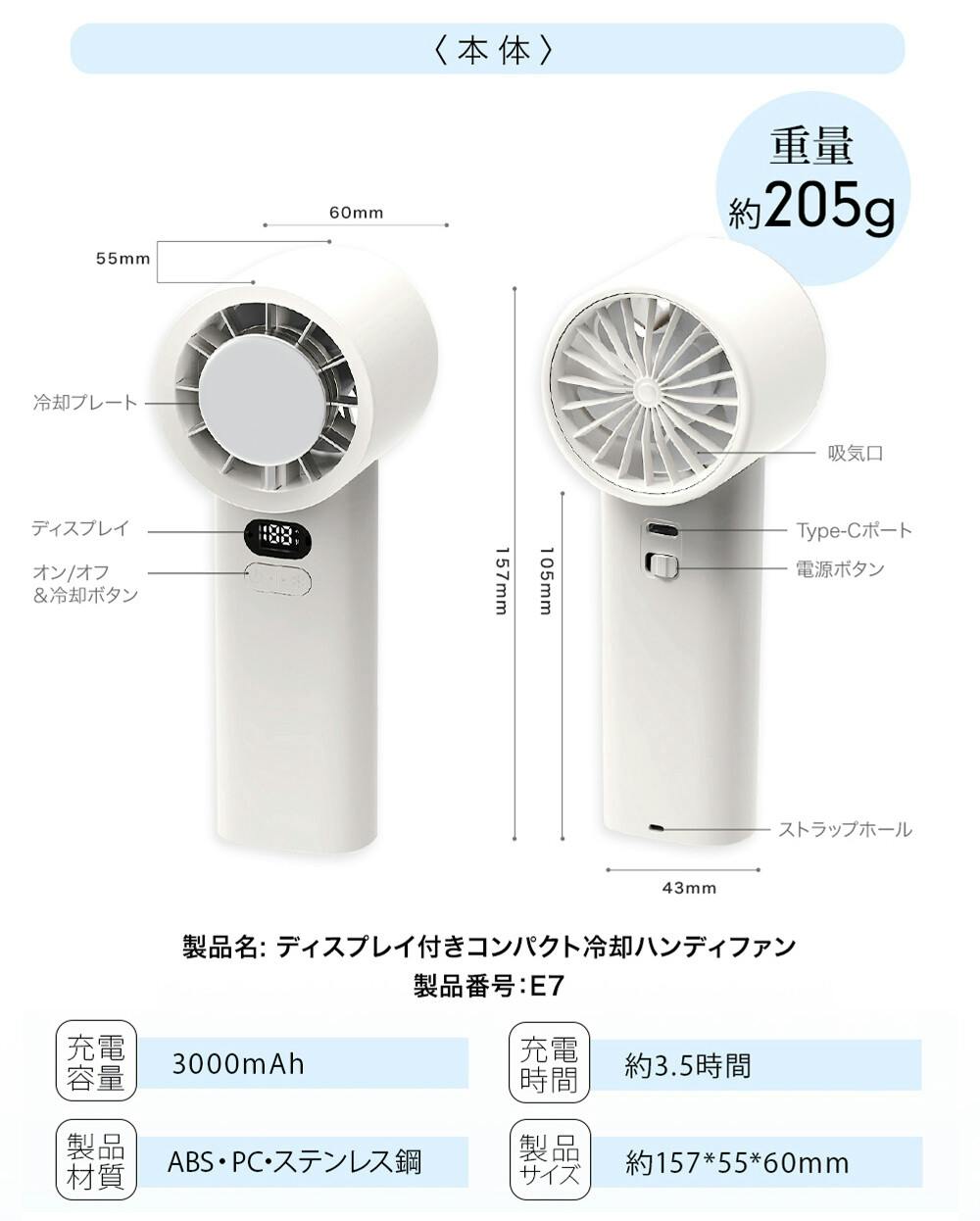 ●製品仕様/製品名: 高速冷却ハンディファン/サイズ:約179×56×58mm/重量:約206g/電池容量: 3000mAh/定格入力:5V/2A/充電方法:USB Type-C/充電時間: 約3時間/持続時間:ファンのみ使用/1段階:約13時間/25段階:約7時間/50段階:約4時間/75段階:約3時間/100段階:約2.2時間 ファン+冷却使用/1段階:約2時間/25段階:約1.6時間/50段階:約1.4時間/75段階:約1.2時間/100段階:約1時間 風量調節:100段階