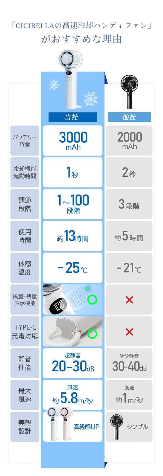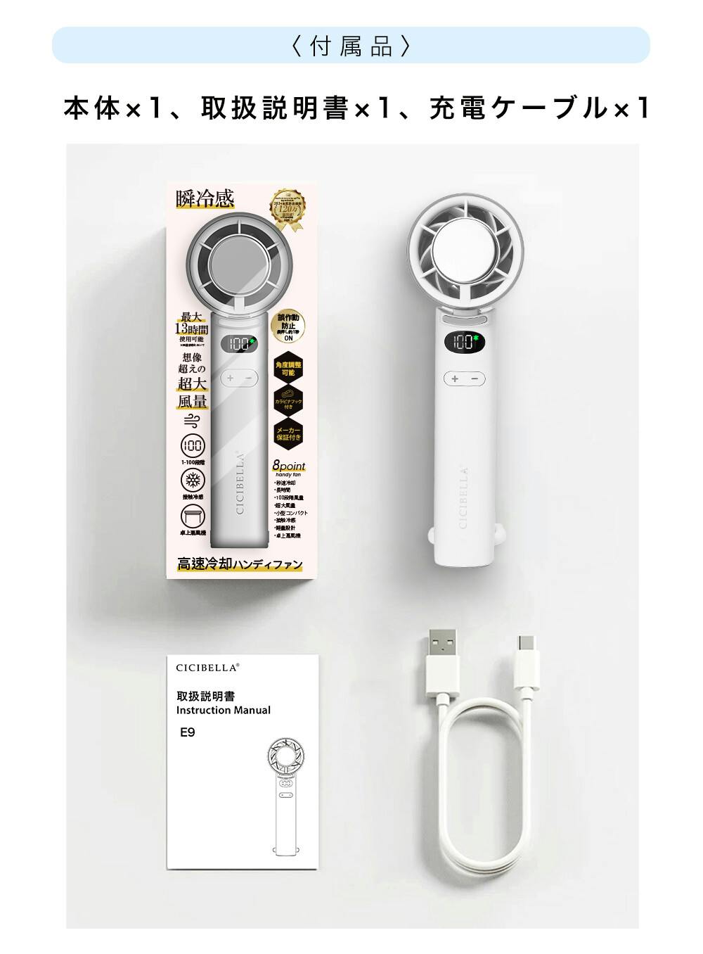 CICIBELLA 高速冷却ハンディファン100段階の風量調整 × 強力冷却プレート搭載!片手で持ちやすいコンパクト設計ながら、3000mAh大容量バッテリー で長時間使用可能!風量は1~100段階まで細かく調整できるので、通勤・オフィス・アウトドアなどあらゆるシーンで最適な涼しさを提供します。POINT強力冷却プレート搭載100段階の風量調整USB Type-C急速充電軽量&コンパクトファンのみ使用なら最長13時間連続運転可能!