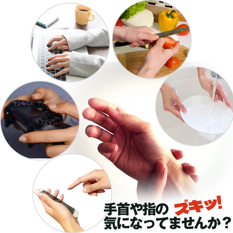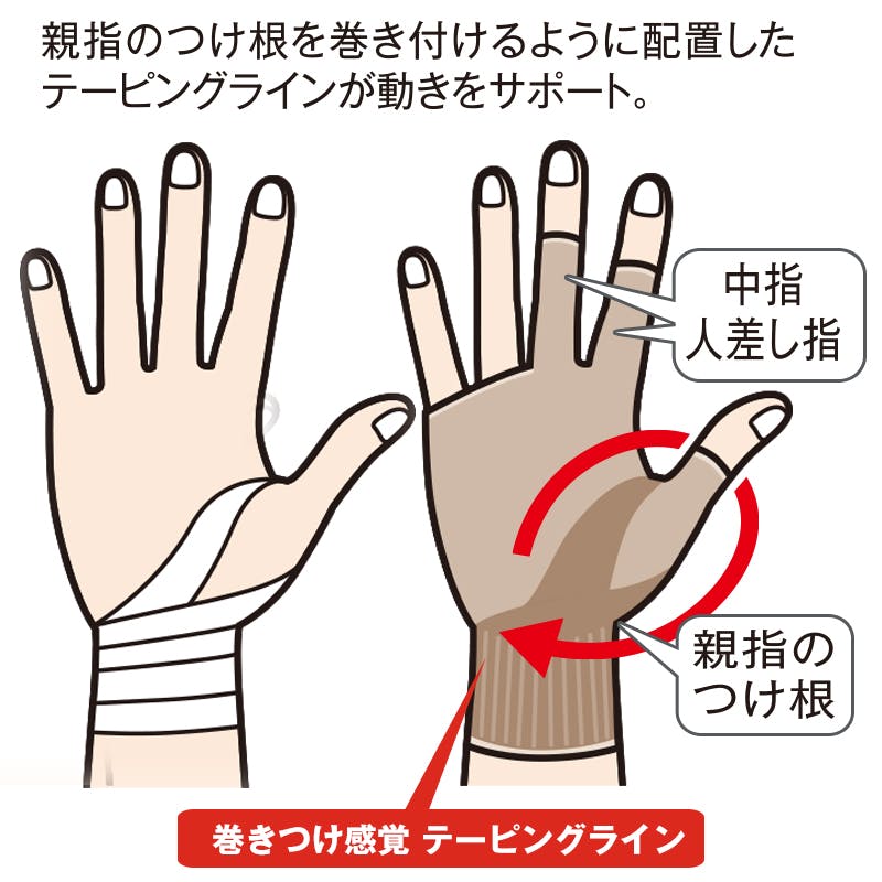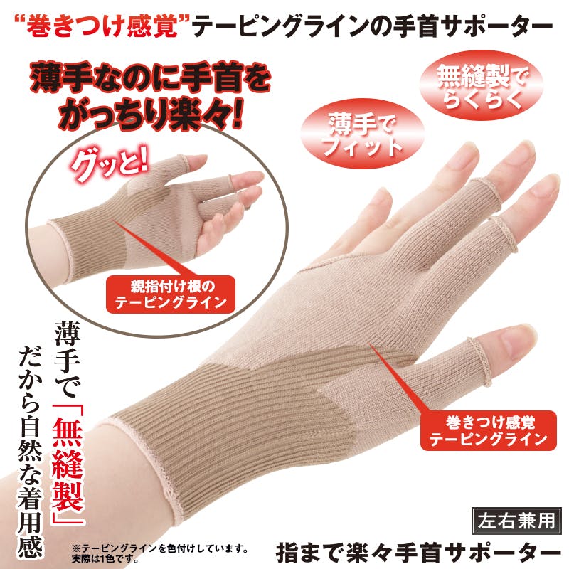 【指まで楽々手首サポーター S-M 2枚セット】 ちあふる 親指のつけ根を巻き付けるように配置したテーピングラインが手首をグッとサポートする薄手サポーター。人差し指と中指は指サポートがついるので、長時間指を動かす人にもやさしいタイプ。JAN:4580372172551