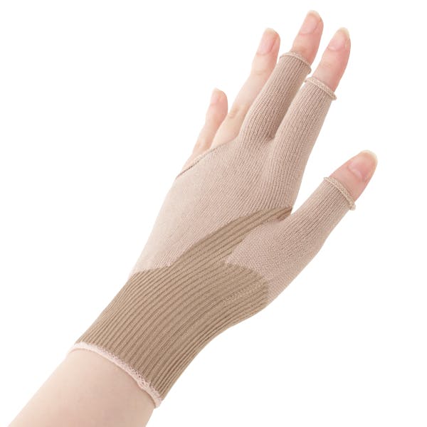 【指まで楽々手首サポーター M-L 1枚(片手分)】 ちあふる 親指のつけ根を巻付けるように配置したテーピングラインが手首をグッとサポートする薄手サポーター。人差し指と中指は指サポートがついるので、長時間指を動かす人にもやさしい JAN:4580372172667