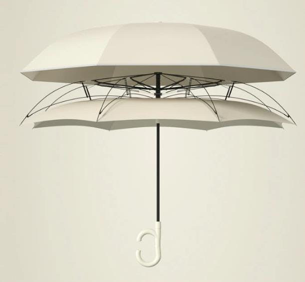 閉傘時に濡れた面が内側に収納される特殊機構を採用。通勤電車の乗降時や店舗入口での雨滴飛散を99%抑制。ビジネスマンの革鞄やOLのスーツを水滴から守る「マナー傘」として開発されました。
