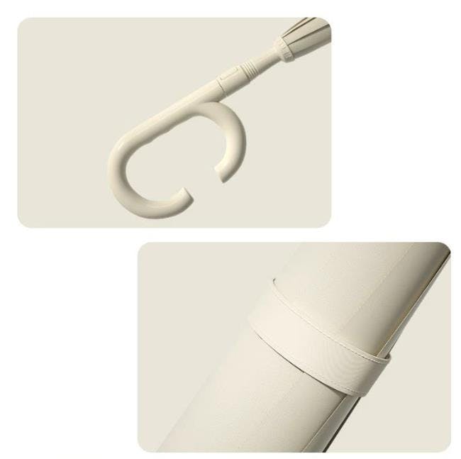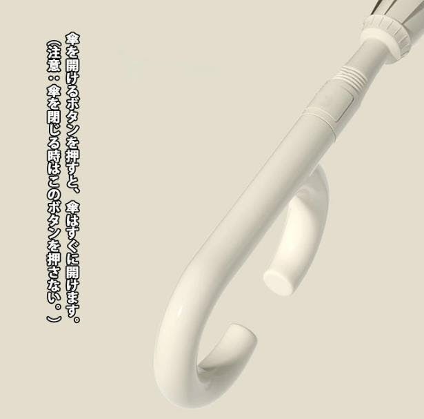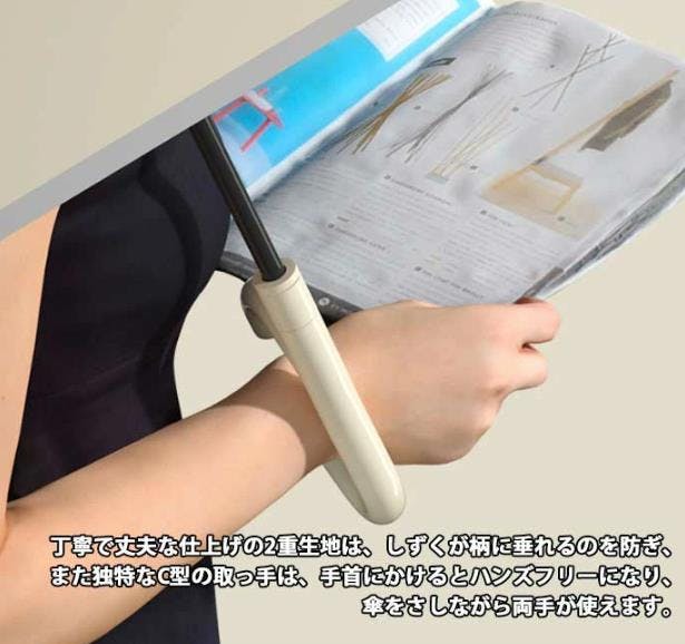 独自開発のC型ハンドルは手首フック式設計。傘を閉じたままスマホ操作/荷物の受け渡しが可能なだけでなく、自動開傘ボタン(ワンタッチオープン)で突然の雨にも即対応。片手で開閉可能なユニバーサルデザインです。