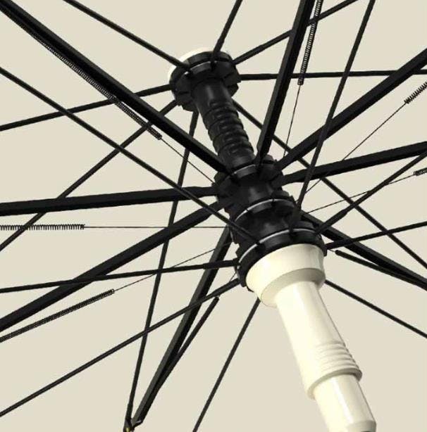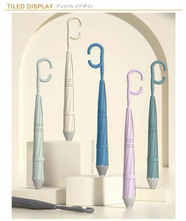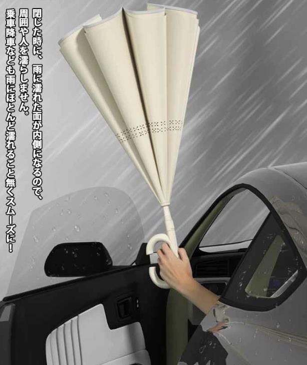 閉傘時に濡れた面が内側に収納される特殊機構を採用。通勤電車の乗降時や店舗入口での雨滴飛散を99%抑制。ビジネスマンの革鞄やOLのスーツを水滴から守る「マナー傘」として開発されました。