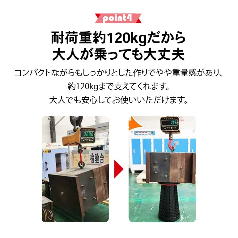コンパクトながらもしかりとした作りでやや重量感があり、約120kgまで支えてくれます。大人でも安心してお使いいただけます。