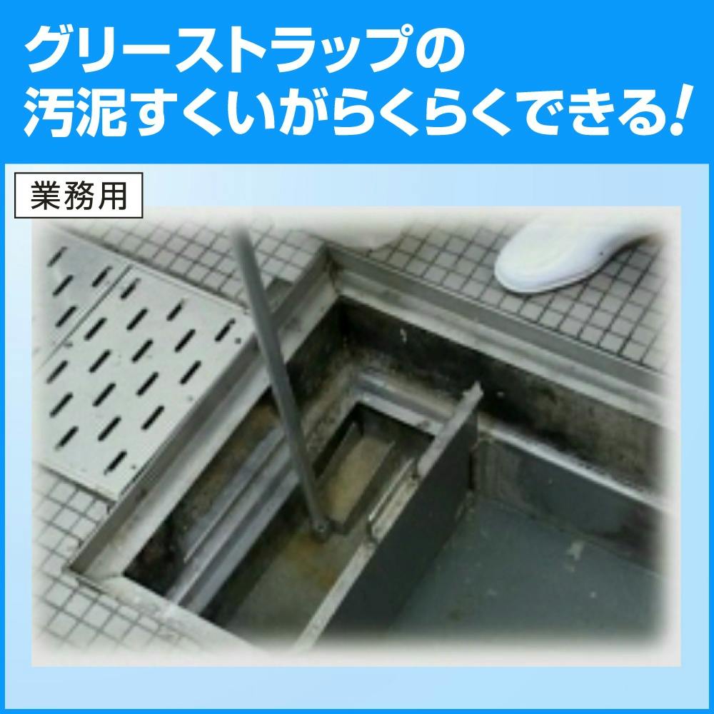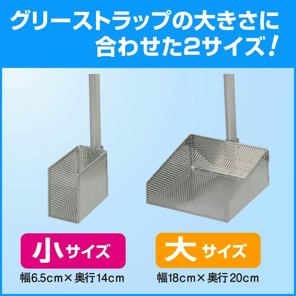 角型形状でコーナー部分の汚泥もすっきり取れます(グリーストラップ清掃用品シリーズ)グリーストラップの底に沈んだ汚泥をすくいとるための道具です。油を吸着したKaoグリース吸着シートの取り出しにも最適です。ヘッド部は角型形状で、コーナー部分の汚泥もすっきり取れます。ヘッド部はメッシュ構造で、汚泥すくいの際、余分な水分をすくうことなくしっかりと水切りできます。本体の軽量化と長さの最適設計で、楽な姿勢で作業ができます。小と大の2サイズあります。