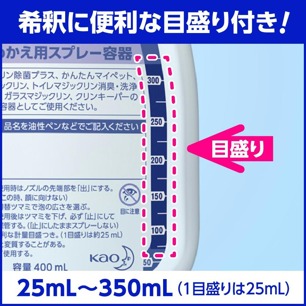 ノズルの切替つまみでスプレーする泡の広さを選べるマジックリン除菌プラス、かんたんマイペット、バスマジックリンシリーズ、トイレマジックリン消臭・洗浄スプレーシリーズ、ガラスマジックリン、クリンキーパーに使用できる、住居用洗剤つめかえ用スプレー容器です。希釈に便利な計量目盛り付きです。長期間の使用でもラベルがはがれにくい容器です。ノズルの切替つまみでスプレーする泡の広さを選べます。