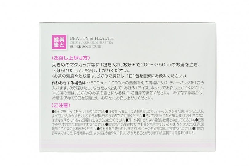 ●1日1包を目安にお召し上がりください。●1日の目安量以上に過剰摂取したり、ティーバッグを長く浸しすぎると、人によってはおなかがゆるくなりすぎる事がありますので、ご注意ください。●初めてお飲みになる方は、最初は少しずつまたは濃度を薄めに作るなど調節をしながらお飲みください。●万一体質に合わない場合は飲用を中止してください。妊娠中・授乳中の方は、飲用をお控えください。その他パッケージをよく読んでからご使用下さい。