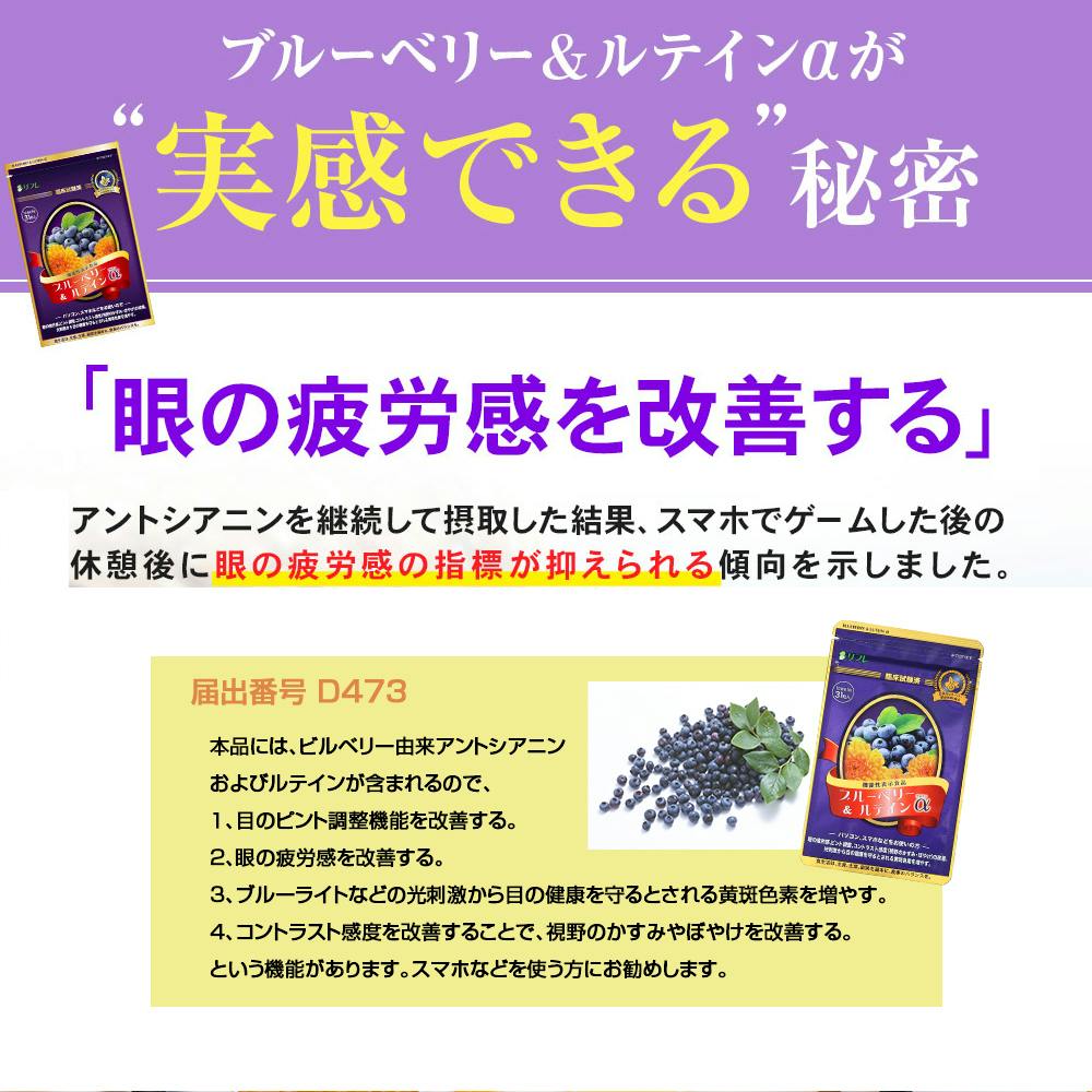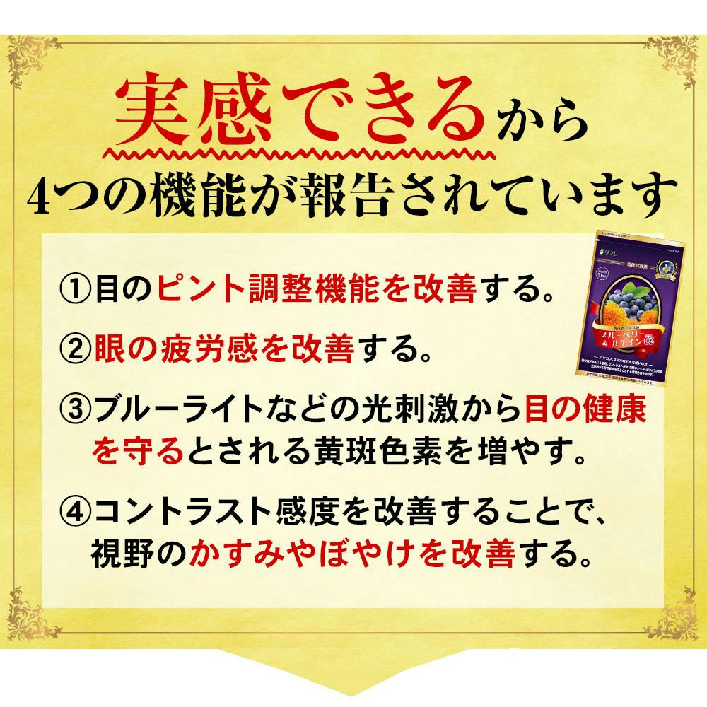 本品には、ビルベリー由来アントシアニンおよびルテインが含まれるので、1、目のピント調整機能を改善する。2、眼の疲労感を改善する。3、ブルーライトなどの光刺激から目の健康を守るとされる黄斑色素を増やす。4、コントラスト感度を改善することで、視野のかすみやぼやけを改善する。という機能があります。スマホなどを使う方にお勧めします。