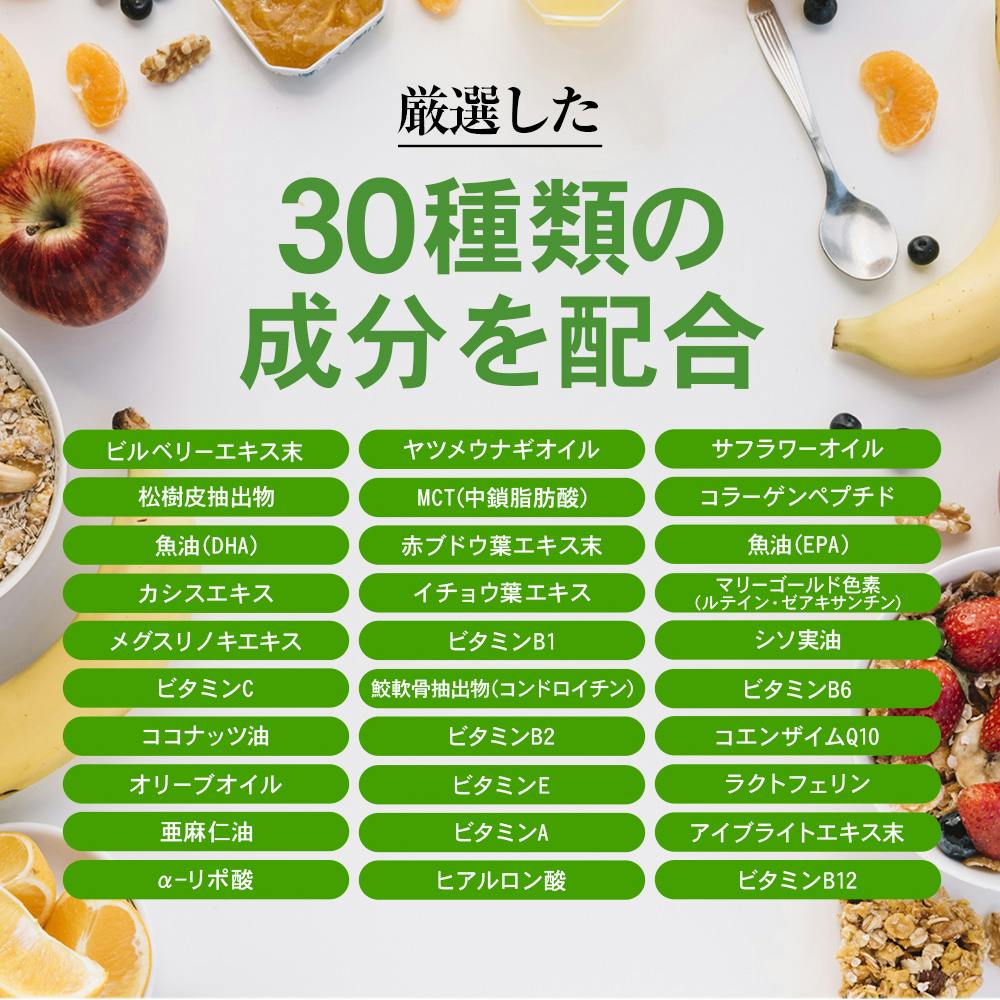 ビルベリーエキス末(ビルベリー(北欧産))、サフラワー油、加工油脂、DHA含有精製魚油(大豆を含む)、イチョウ葉エキス末、メグスリノキエキス末、シソ油、サメ軟骨エキス末、ココナッツオイル、コエンザイムQ10、オリーブ油、アマニ油、アイブライトエキス末、αリポ酸ヤツメウナギ油、松樹皮エキス末、フィッシュコラーゲンペプチド、赤ブドウ葉エキス末、カシスエキス末/ゼラチン、グリセリン、マリーゴールド色素、ミツロウ、グリセリン脂肪酸エステル