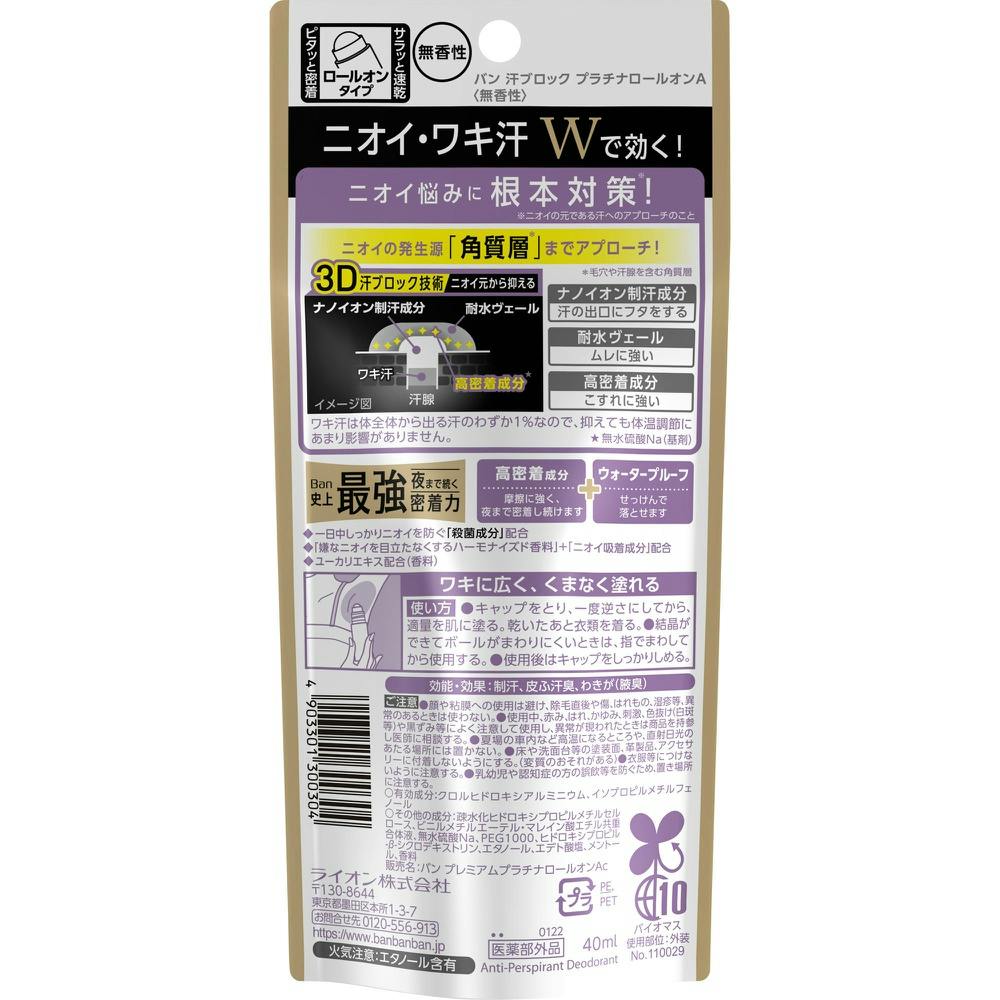 Ban史上No.1密着力・ワキ汗は抑えられる!ワキ汗を抑えられるから夜まで汗ジミ・ニオイ気にせず過ごせるBan史上No.1密着力プラチナロールオン。1ナノイオン制汗成分が汗の出口にフタをして、汗ジミやニオイの原因となるワキ汗を出る前にブロック2高密着・ウォータープルーフ処方で、こすれ・ムレに強く、夜まで落ちにくい。3ニオイ菌の増殖を抑える殺菌成分に加え、「ニオイ吸着成分+嫌なニオイを目立たなくするハーモナイズド香料」を新配合。4無香性。