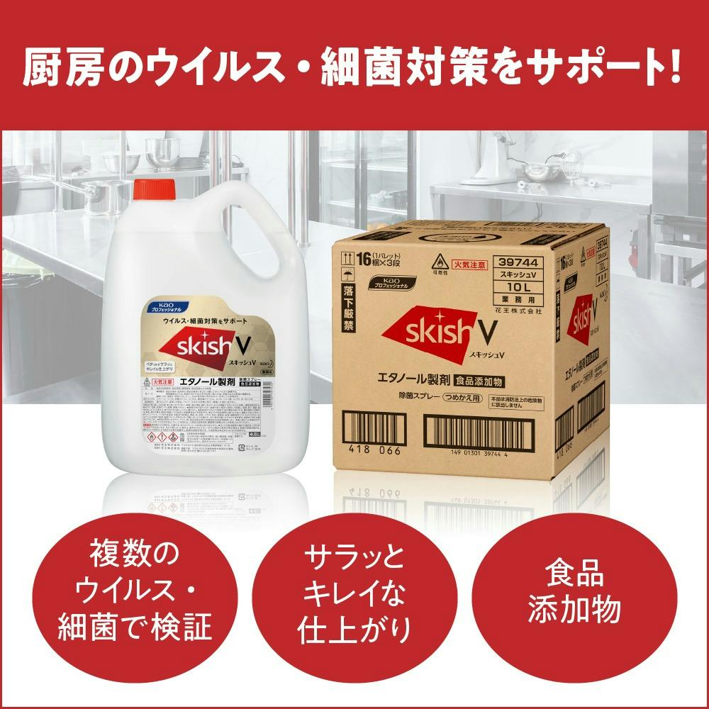 厨房内のノロウイルス対策にウイルス・細菌対策をサポート。ウイルス除去までできる、エタノール製剤です。ベタつかずサラッとキレイな仕上がりで、調理器具や機器、食品容器などの除菌・ウイルス除去にお使いいただけます。食品添加物なので、食品の品質保持にも。消防法上の危険物に該当しないので、備蓄等にも適しています。エタノール濃度(溶剤):65vol%。非危険物【食品添加物】