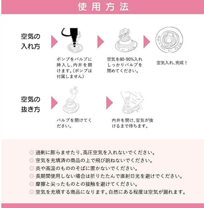 空気を入れる浮き輪なので、エアポンプで空気入れをおすすめします。空気抜いた後、コンパクトに畳め、持ち運びやすいです。また、邪魔にならず、省スペースに収納できます。長時間使用しない場合、必ず乾して保管してください