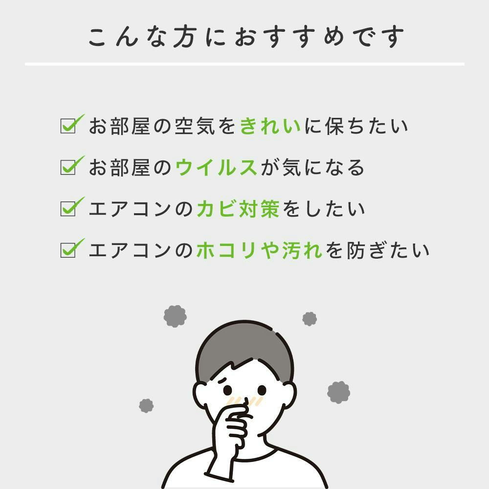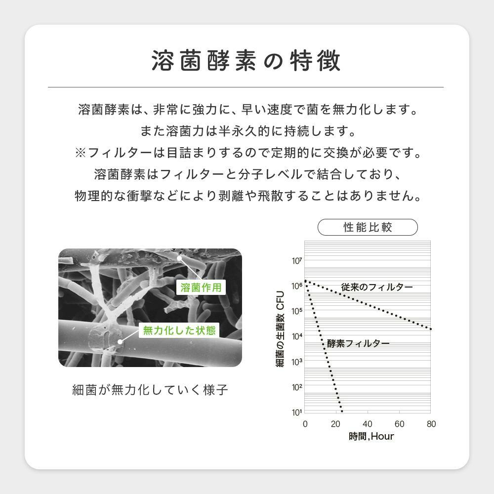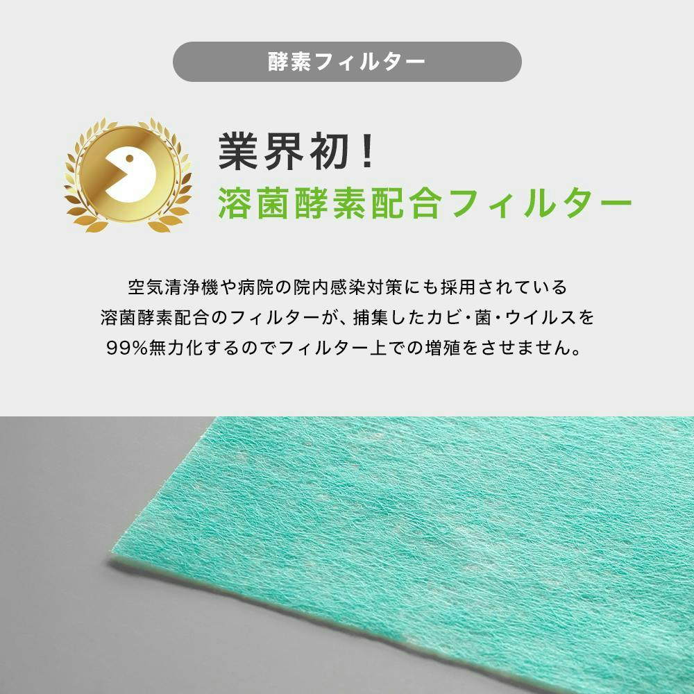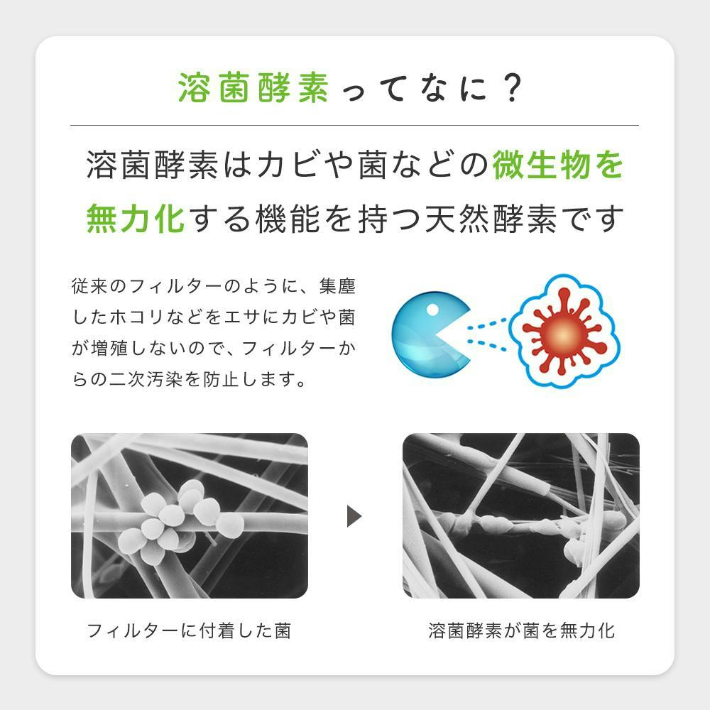 病院の空気清浄機などで院内感染対策にも採用されている溶菌酵素配合のフィルターが、捕集したカビ・菌・ウイルスを99%無力化するのでフィルター上での増殖をさせません。