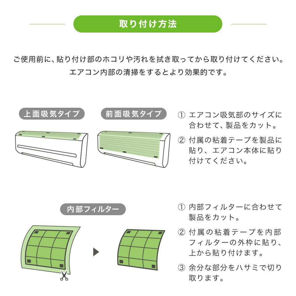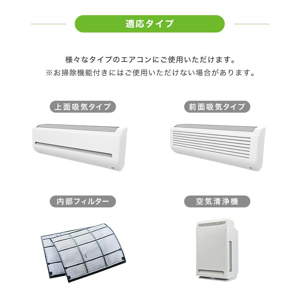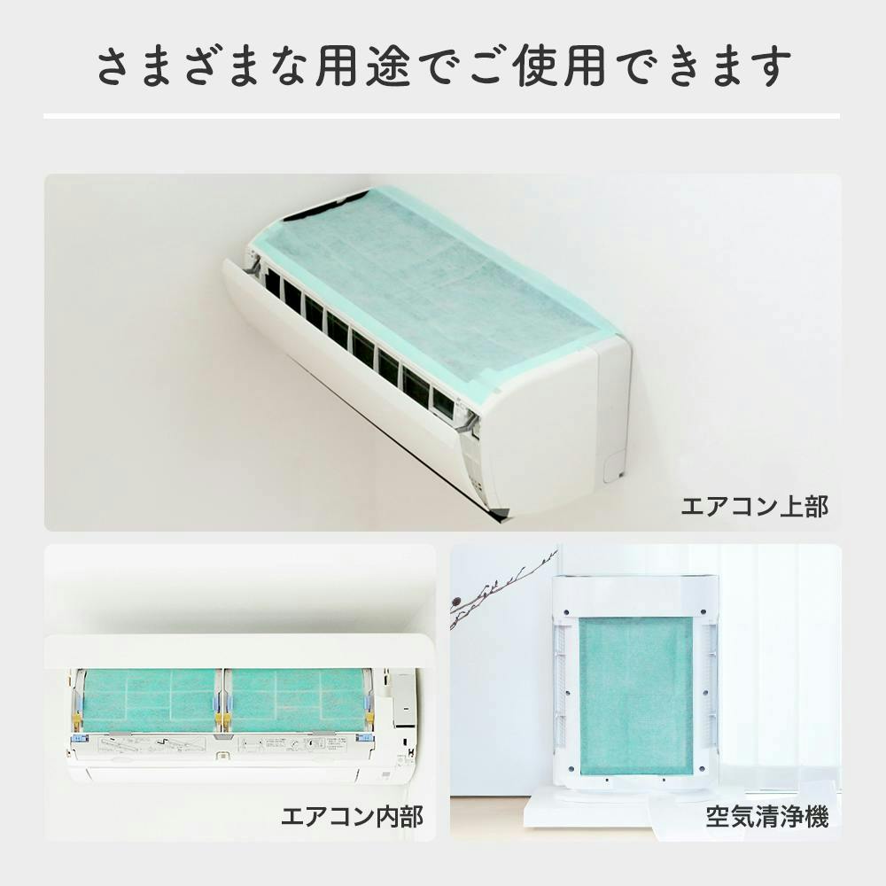 エアコンの吸気部、エアコン内部のフィルター、空気清浄機の背面などさまざまな用途でお使いいただけます。(お掃除機能付きなどの機種にはご使用いただけない場合がございます。)両面粘着テープ16枚付き