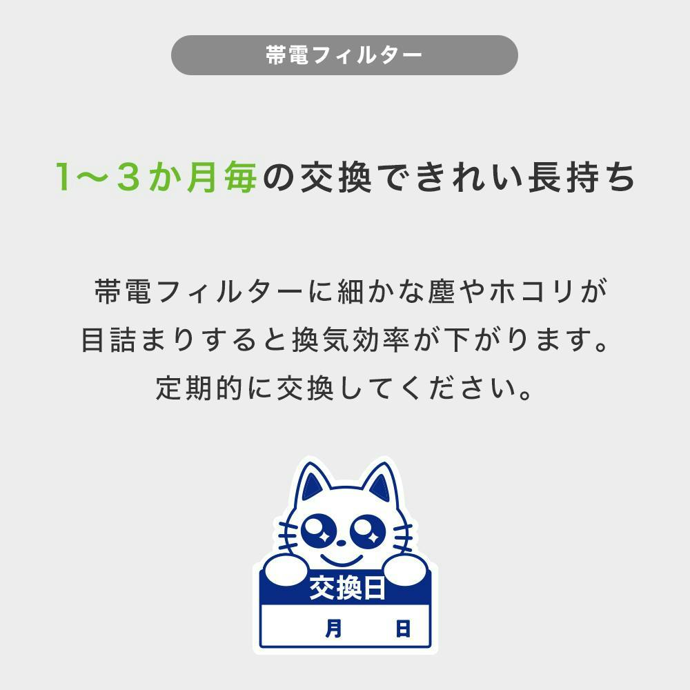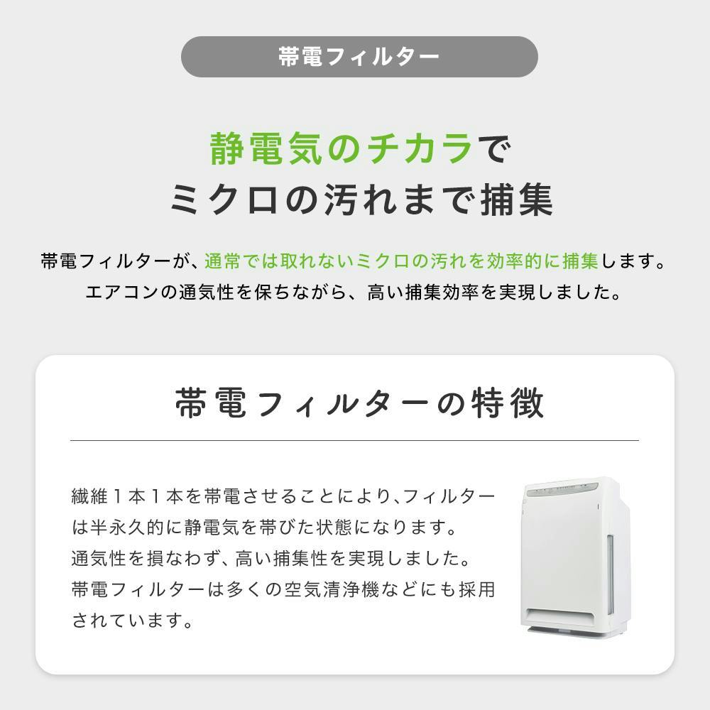 さらに帯電フィルターが静電気のチカラで通常では取れないホコリや細かなチリまで捕集します。通気性を損なわずに高い捕集性を実現します。