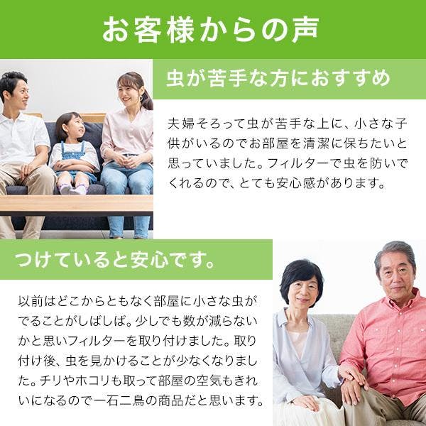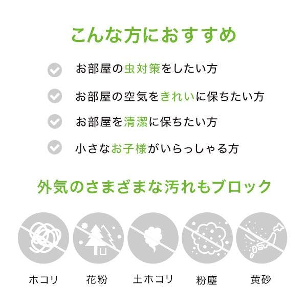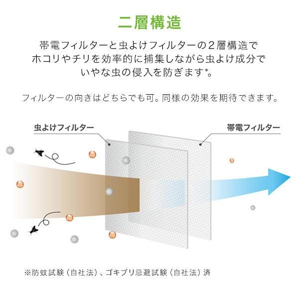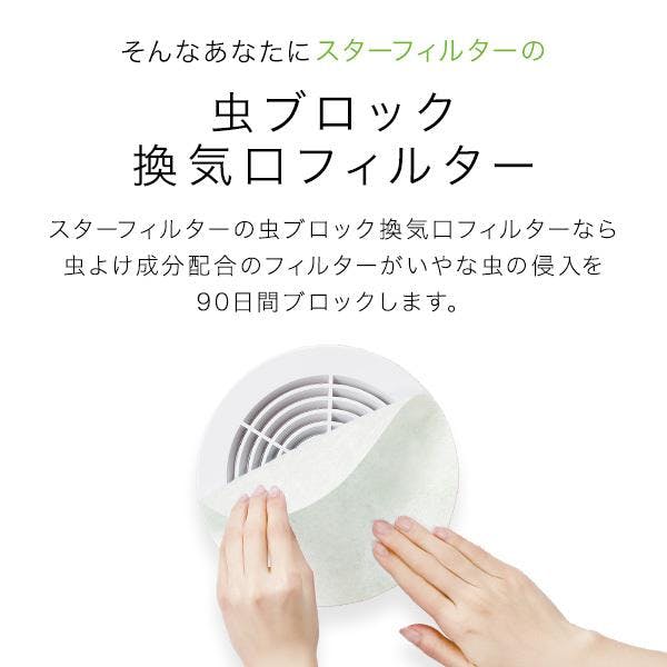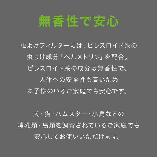 虫よけフィルターと帯電フィルターの2層構造。虫よけフィルターは無香性のピレスロイド系の虫よけ成分「ペルメトリン」を配合しており、人体への安全性も高いため、お子様のいるご家庭や犬・猫・ハムスター・小鳥などの哺乳類・鳥類を飼育されているご家庭でも安心してお使いいただけます。外から直接外気が入ってくる「換気口」は知らないうちに虫の侵入経路になることも。スターフィルターの虫ブロック換気口フィルターなら虫よけ成分配合のフィルターがいやな虫の侵入をブロックします。屋内用。