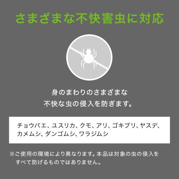 防虫試験(自社法)を行っており、身の回りのさまざまな不快害虫の侵入を防ぎます。適用害虫:ユスリカ、チョウバエ、その他不快害虫