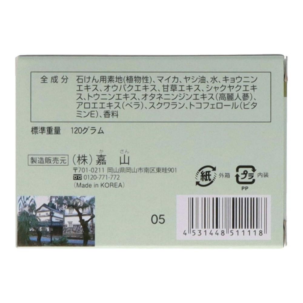 【材質・素材】石鹸素地、枚カ(麦飯石)、ヤシ油、水、キョウニンエキス、黄柏エキス、甘草エキス、芍薬エキス、桃仁エキス、オタネニンジンエキス(高麗人参)、アロエ(べラ)、スクワラン、ト個フェロール(ビタミンE)、香料