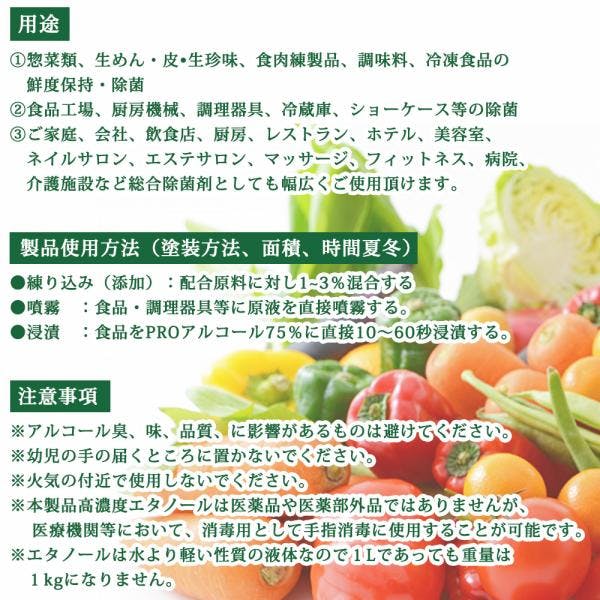 ●PROアルコール 濃度75% 食品添加物 1L●内容成分:エタノール:67.900% 乳酸ナトリウム:0.025% 精製水:32.075%【用途】・総菜類、生めん・皮・生珍味、食肉練製品、調味料、冷凍食品の鮮度保持・除菌・食品工場、厨房機械、調理器具、冷蔵庫、ショーケース等の除菌・ご家庭、会社、飲食店、厨房、レストラン、ホテル、美容室、ネイルサロン、エステサロン、マッサージ、フィットネス、病院、介護施設など総合除菌剤としても幅広くご使用いただけます。