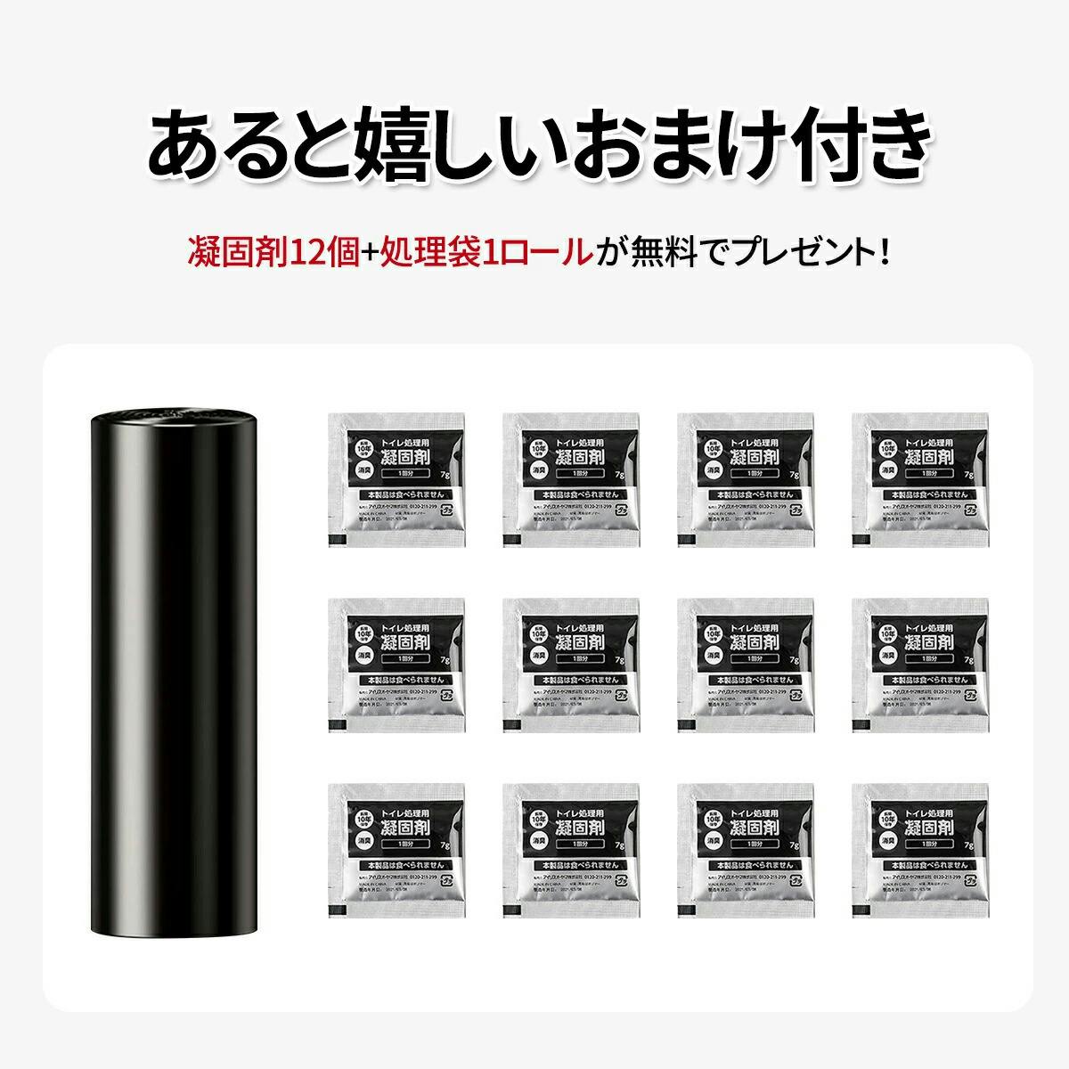 ポータブルトイレ本体、凝固剤、処理袋が付属し、すぐに使用可能な完全セット