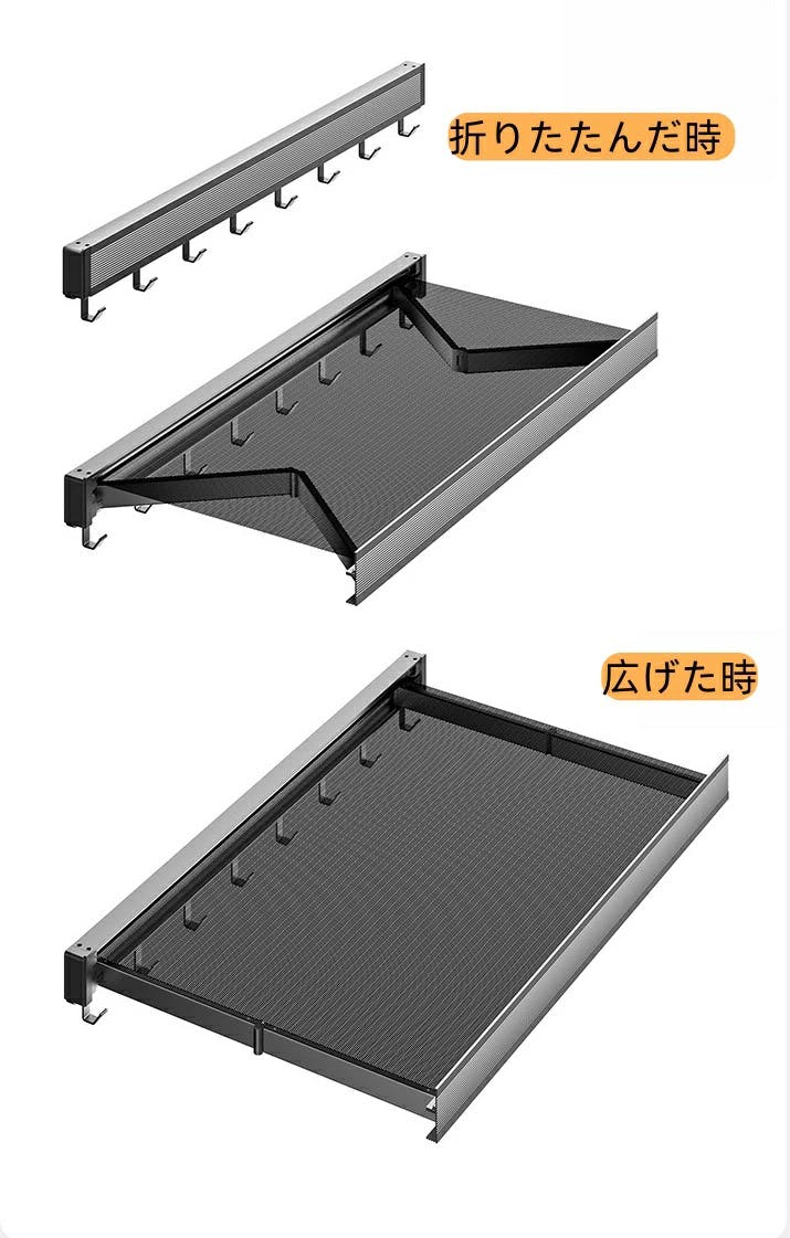 アルウム合金製 表面マットパウダーコーティング スライドレールデイン スペースアルミは錆び酸化しにくい メッシュは細かい通気性 高速排水 折りたたみ伸縮設計 省スペース 折りたたみフック 折りたたみバスタオルラックです