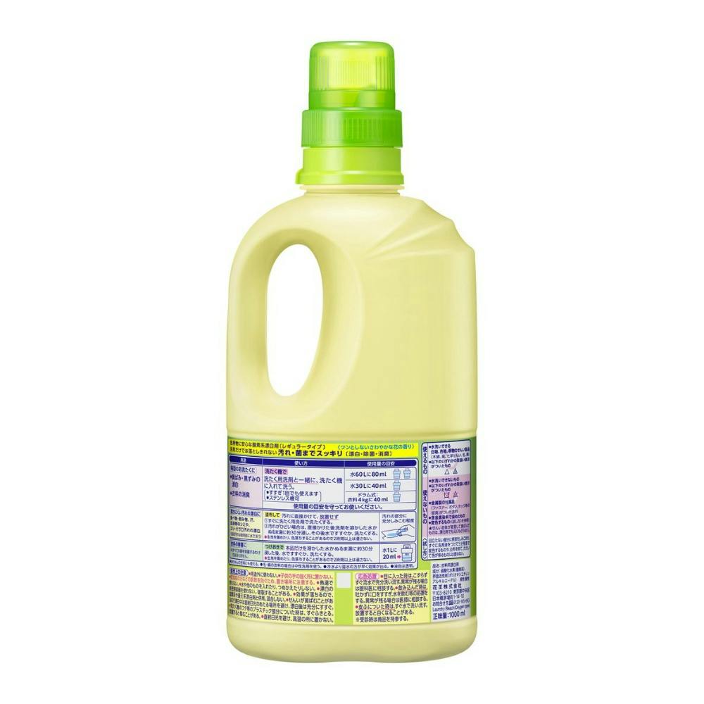 色柄ものにも安心な酸素系漂白剤の液体タイプ。洗剤では落としきれない汚れや菌を分解、ためこまない。色柄物にも安心な酸素系漂白剤の液体タイプ。洗剤だけでは落としきれない汚れや菌をもとから落としスッキリ。毎日のお洗たくをより清潔に!洗たく用洗剤と一緒に洗たく機に入れて洗う。ツンとしないさわやかな花の香り。