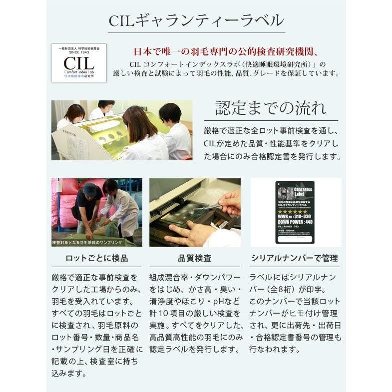 厳格で適正な全ロットの事前検査を通し、CILが定めた品質・性能基準をクリアできた場合にのみ合格認定証を発行します。組成混合率、ダウンパワー、臭い、清浄度など様々な指標を適切な方法で検査することで、充填羽毛がその性能を発揮する最適な状態を保持し、安心してご使用いただけることを保証します。