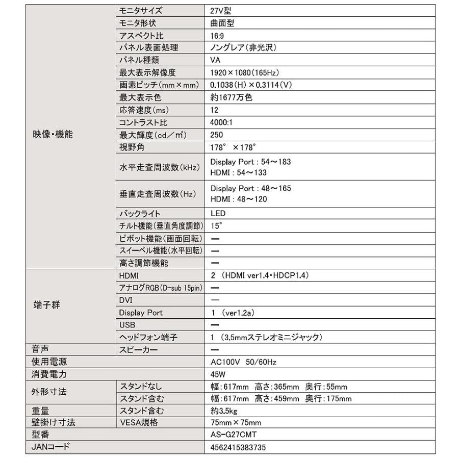 液晶モニター 27型 27インチ フルハイビジョン FHD 曲面 ゲーミングモニター ディスプレイ PCモニター ノングレアパネル 壁掛け対応 27V型 WIS AS-G27CMT