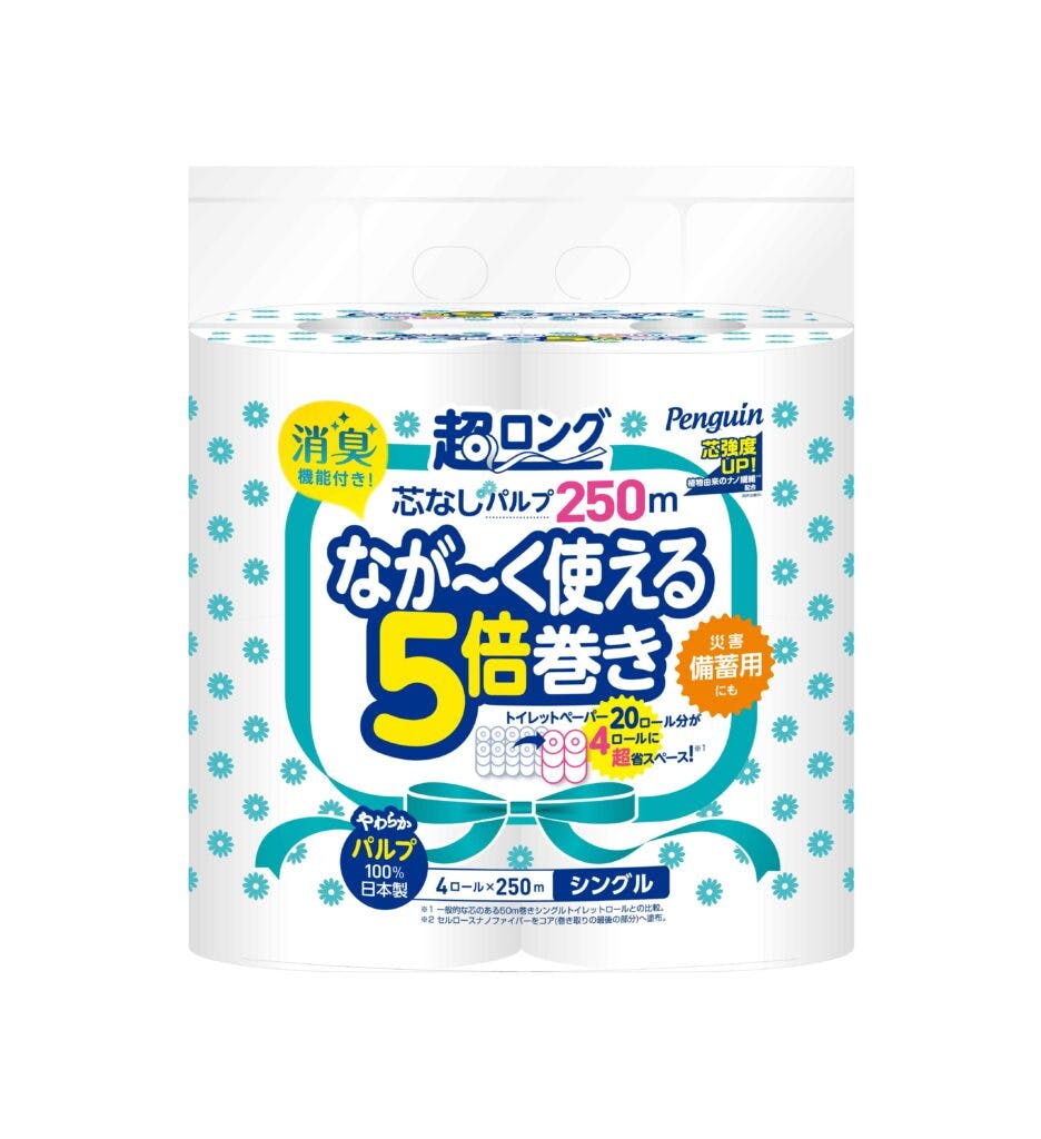 消臭機能付き。超ロングシリーズ。芯なしパルプ 250m、シングル。災害備蓄用にも人気です。トイレットペーパー20ロール分を4ロールに。やわらかパルプ100%日本製。250m×4ロール入り※一般的な芯のある50m巻きシングルトイレットロールとの比較。