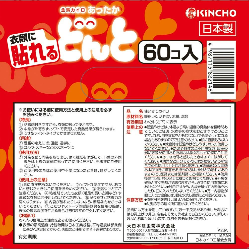 封を切るだけで暖まる封を切るだけで暖まる、粘着剤付きの衣類に貼るカイロ。大容量タイプなので、ヘビーユーザー様におすすめです。約12時間持続。60個入。