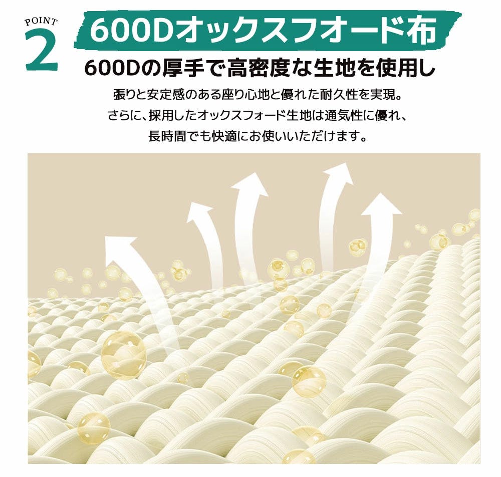 厚手で耐久性に優れたオックスフォード布を使用。しっかりとした張りがあり、快適な座り心地を提供します。