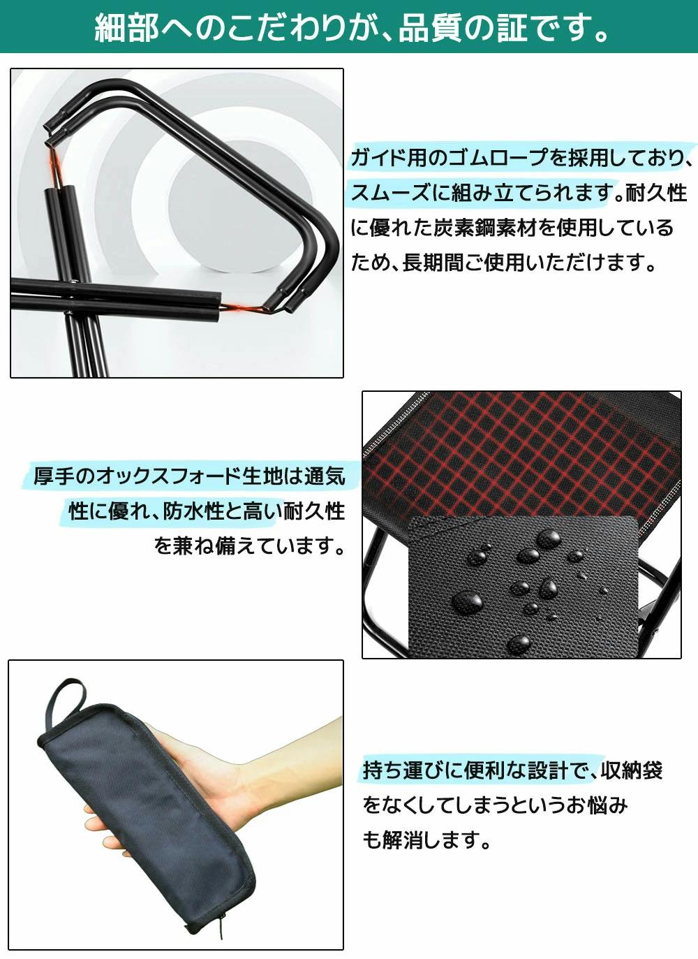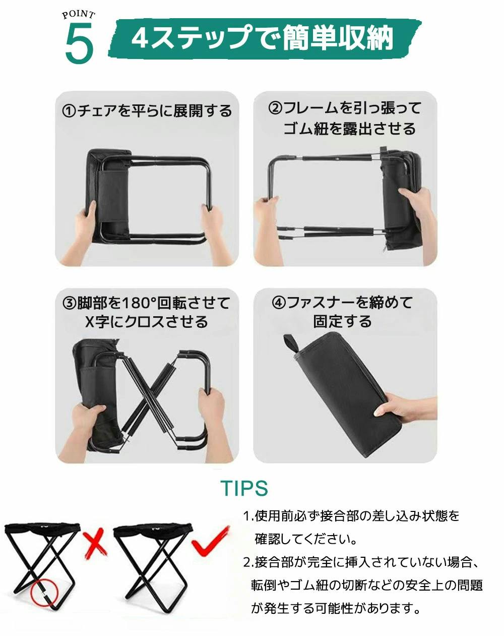 ワンタッチで簡単に折りたため、座面と一体化した収納ケースにすっきり収まります。収納袋をなくす心配もありません。