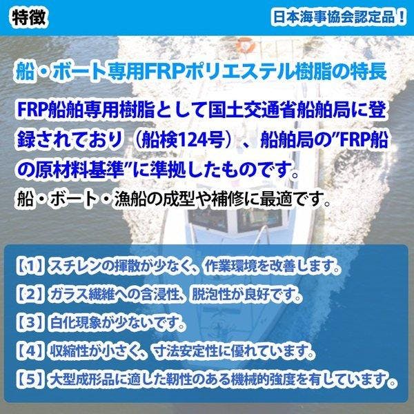 国内一流メーカー製の船舶専用FRP不飽和ポリエステル樹脂を販売しております。★FRP船舶専用樹脂として国土交通省船舶局に登録されており(船検124号)、船舶局の”FRP船の原材料基準”に準拠したものです。船・ボート・漁船の成型や補修に最適です。★【1】スチレンの揮散が少なく、作業環境を改善します。【2】ガラス繊維への含浸性、脱泡性が良好です。【3】白化現象が少ないです。【4】収縮性が小さく、寸法安定性に優れています。【5】大型成形品に適した靭性のある機械的強度を有しています。