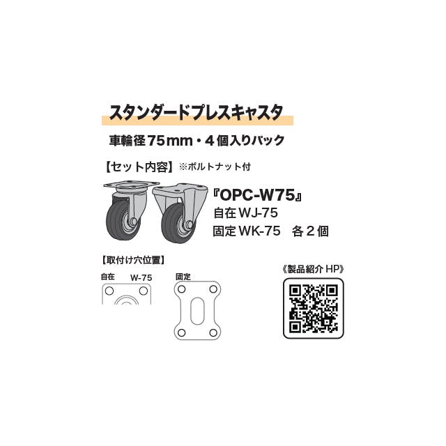 ワンパックキャスタ ボルトナット付 OPC-W75(ゴム車輪75mm自在式2個・固定式2個セット) シシクアドクライス 台車・ワゴン・棚などのDIY用に