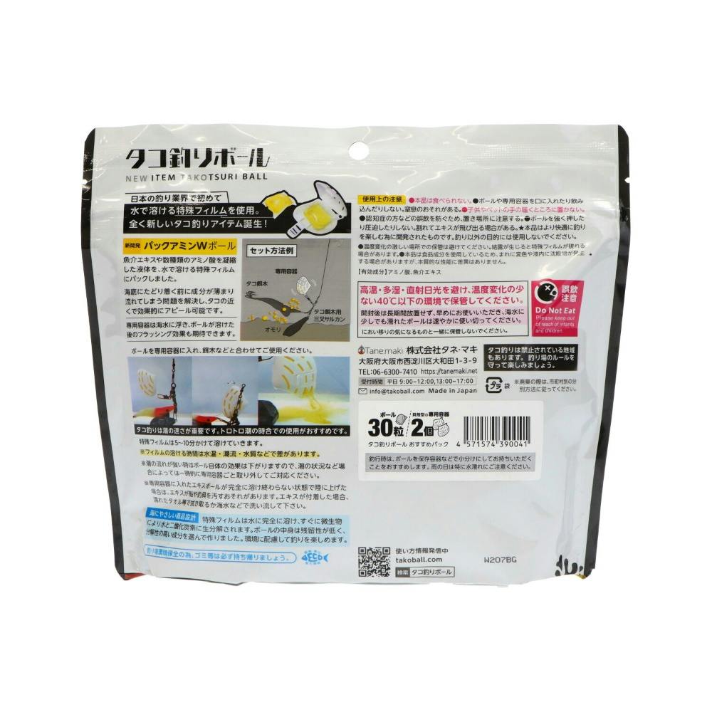 水で溶ける特殊フィルム、全く新しいタコ釣りアイテム「日本の釣り業界で初めて、水で溶ける特殊フィルムを使用。全く新しいタコ釣りアイテム誕生!」魚介エキスや数種類のアミノ酸を凝縮した液体を、水で溶ける特殊フィルムにパックしました。海底にたどり着く前に成分が薄まり流れてしまう問題を解決し、タコの近くで効果的にアピール可能です。