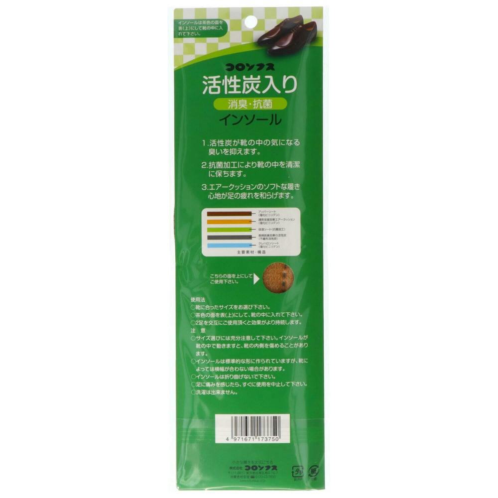 活性炭入り抗菌消臭インソールです。活性炭が靴の中のイヤな臭いを抑えます。抗菌加工で靴の中を清潔に保ちます。エアークッションが足の疲れを和らげます。
