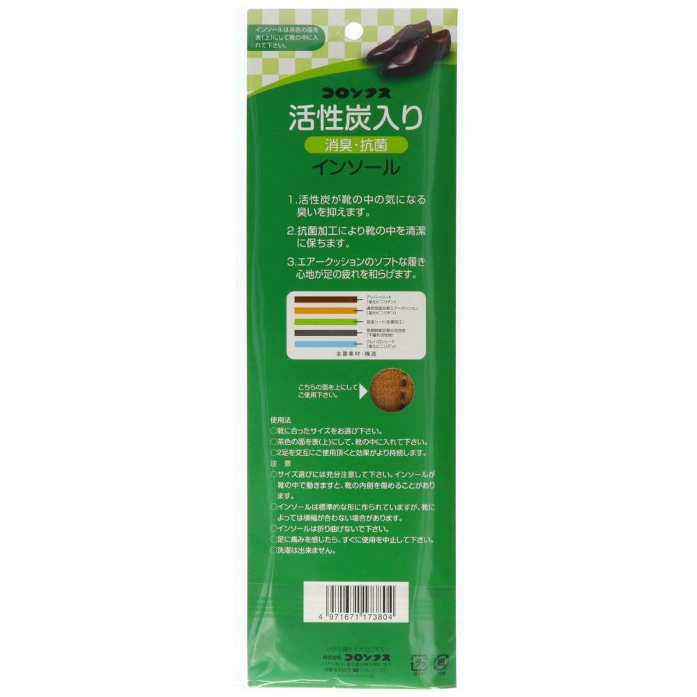 活性炭入り抗菌消臭インソールです。活性炭が靴の中のイヤな臭いを抑えます。抗菌加工で靴の中を清潔に保ちます。エアークッションが足の疲れを和らげます。