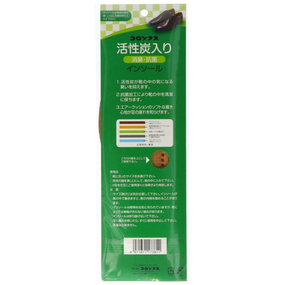活性炭入り抗菌消臭インソールです。活性炭が靴の中のイヤな臭いを抑えます。抗菌加工で靴の中を清潔に保ちます。エアークッションが足の疲れを和らげます。