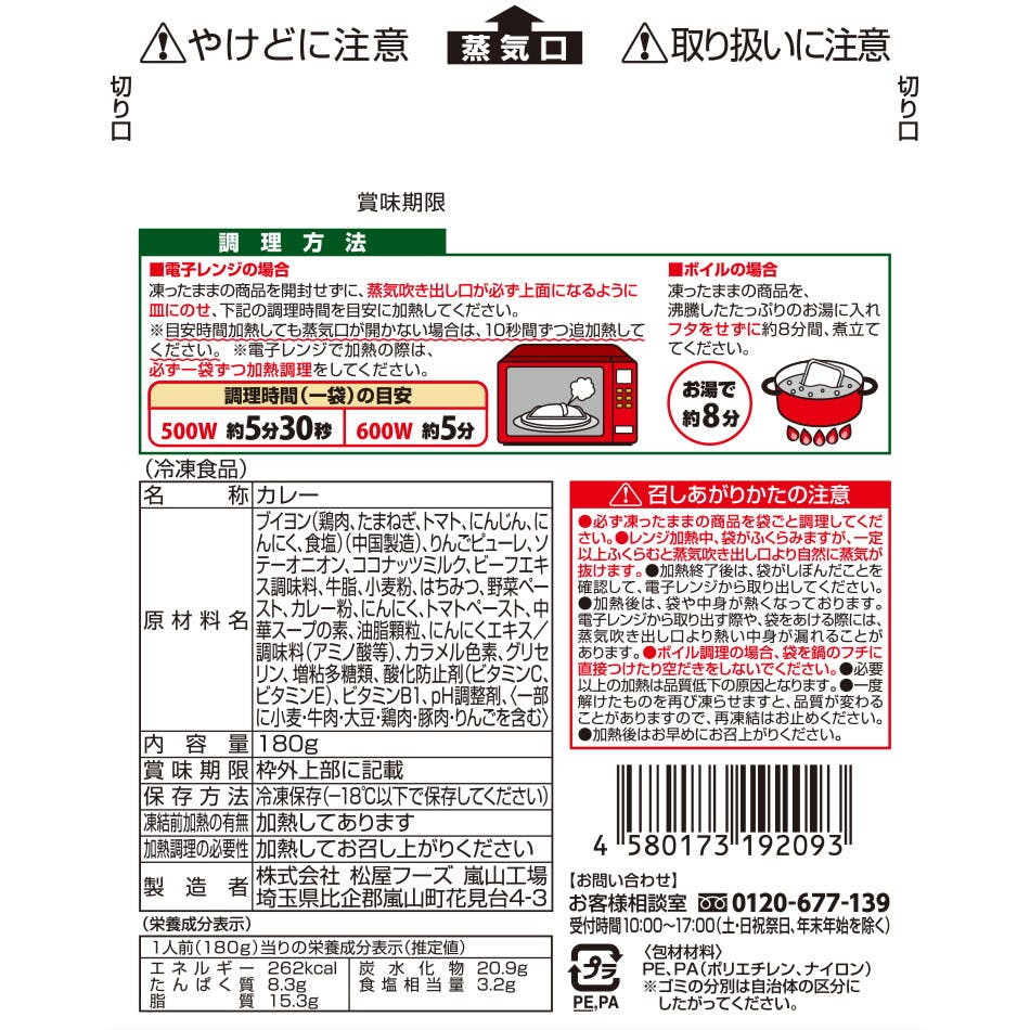 ブイヨン(鶏肉、たまねぎ、トマト、にんじん、にんにく、食塩)(中国製造)、りんごピューレ、ソテーオニオン、ココナッツミルク、ビーフエキス調味料、牛脂、小麦粉、はちみつ、野菜ペースト、カレー粉、にんにく、トマトペースト、中華スープの素、油脂顆粒、にんにくエキス/調味料(アミノ酸等)、カラメル色素、グリセリン、増粘多糖類、酸化防止剤(ビタミンC、ビタミンE)、ビタミンB1、(一部に小麦・牛肉・大豆・鶏肉・豚肉・りんごを含む)