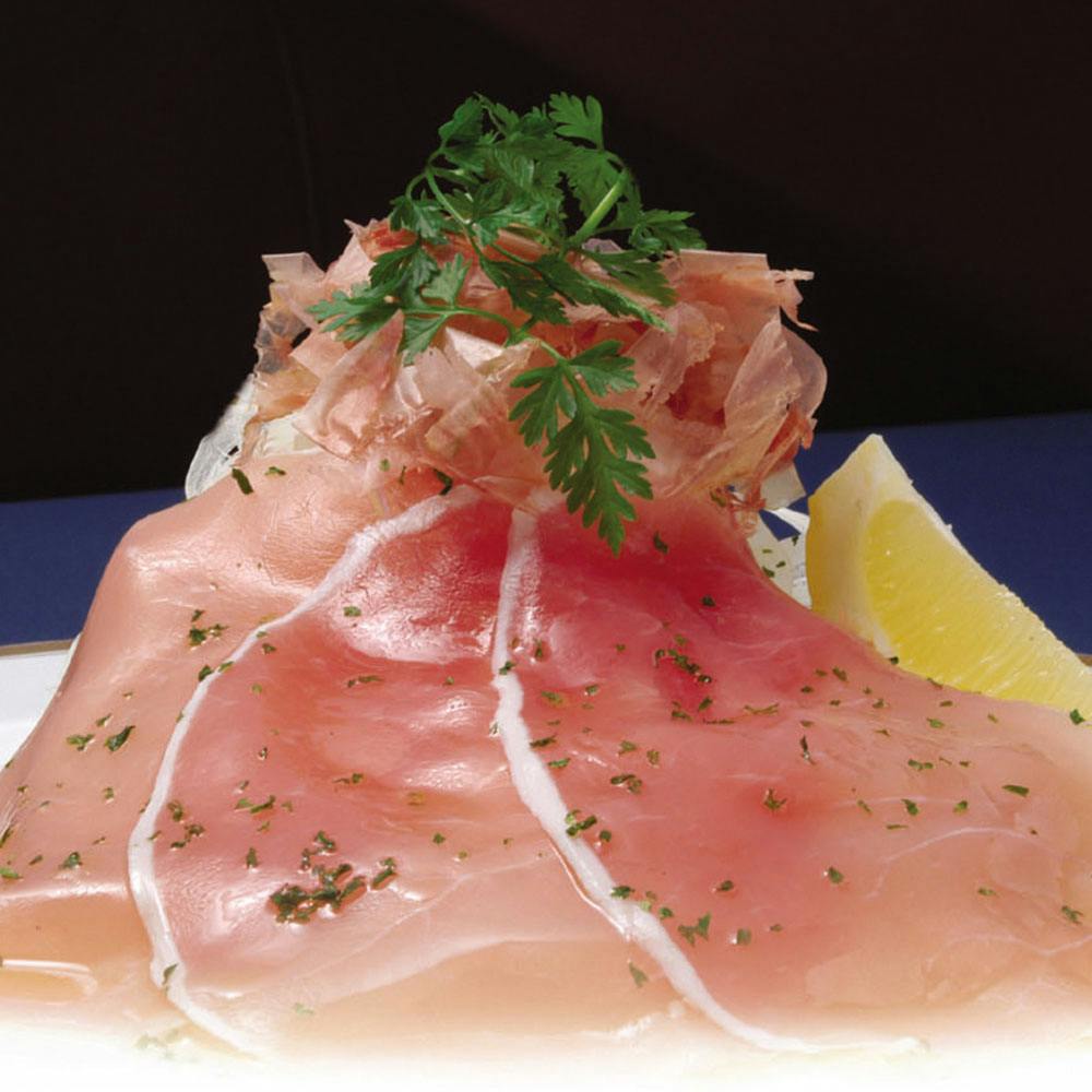 北海道生まれのしばれ生ハムは豚のロース肉にドイツ岩塩で仕上げたまろやかなうす塩味。厚切りにしてお刺身風にわさびを添えて食べるのも美味です。