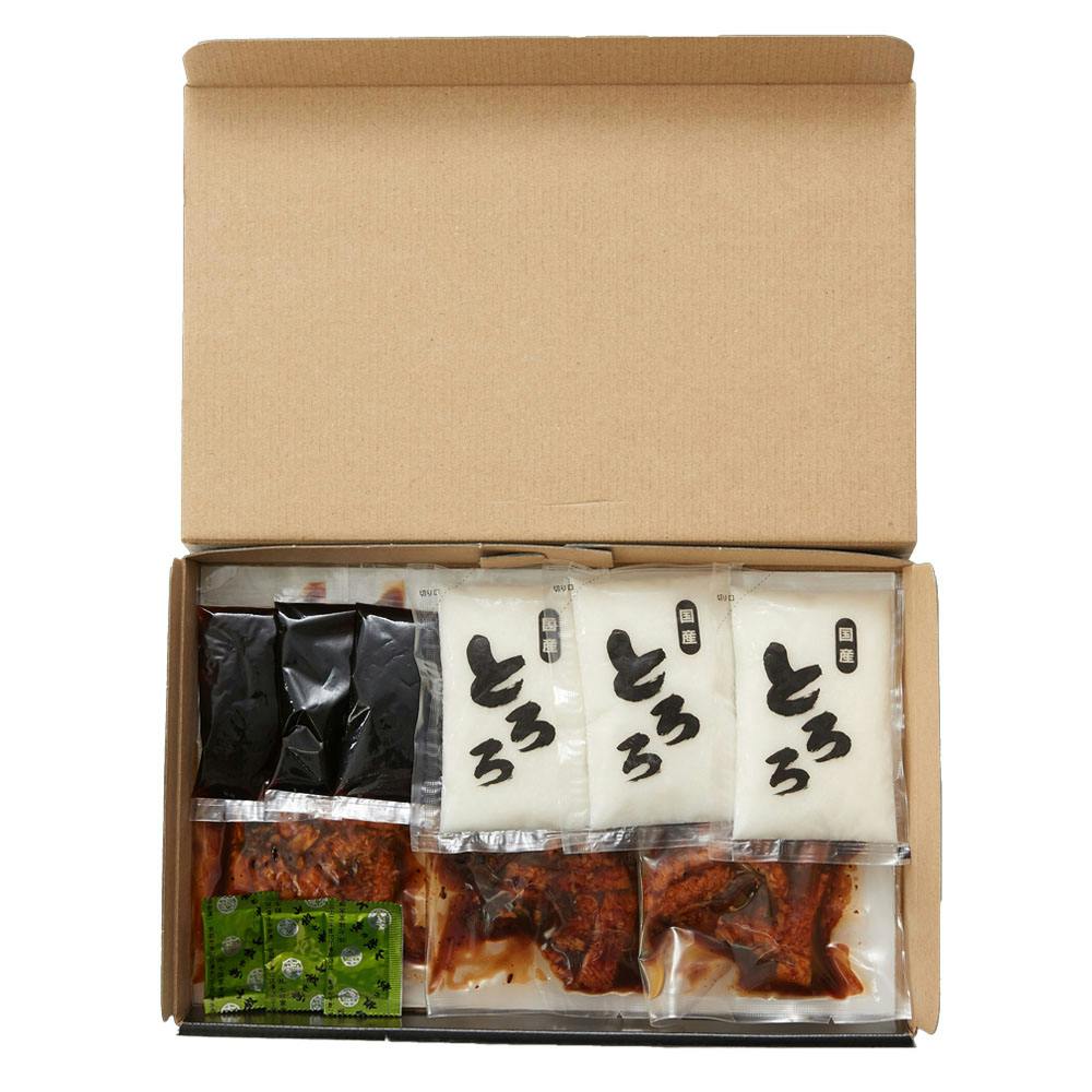 刻みうなぎ50g×3、とろろ50g×3、特製たれ20ml×3、山椒0.2g×3