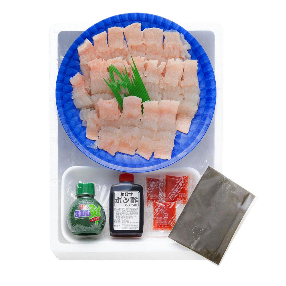 大分産鱧切身×250g、かぼすポン酢70ml×1、カボス果汁70ml×1、もみじおろし10g×3、出汁用昆布×1枚
