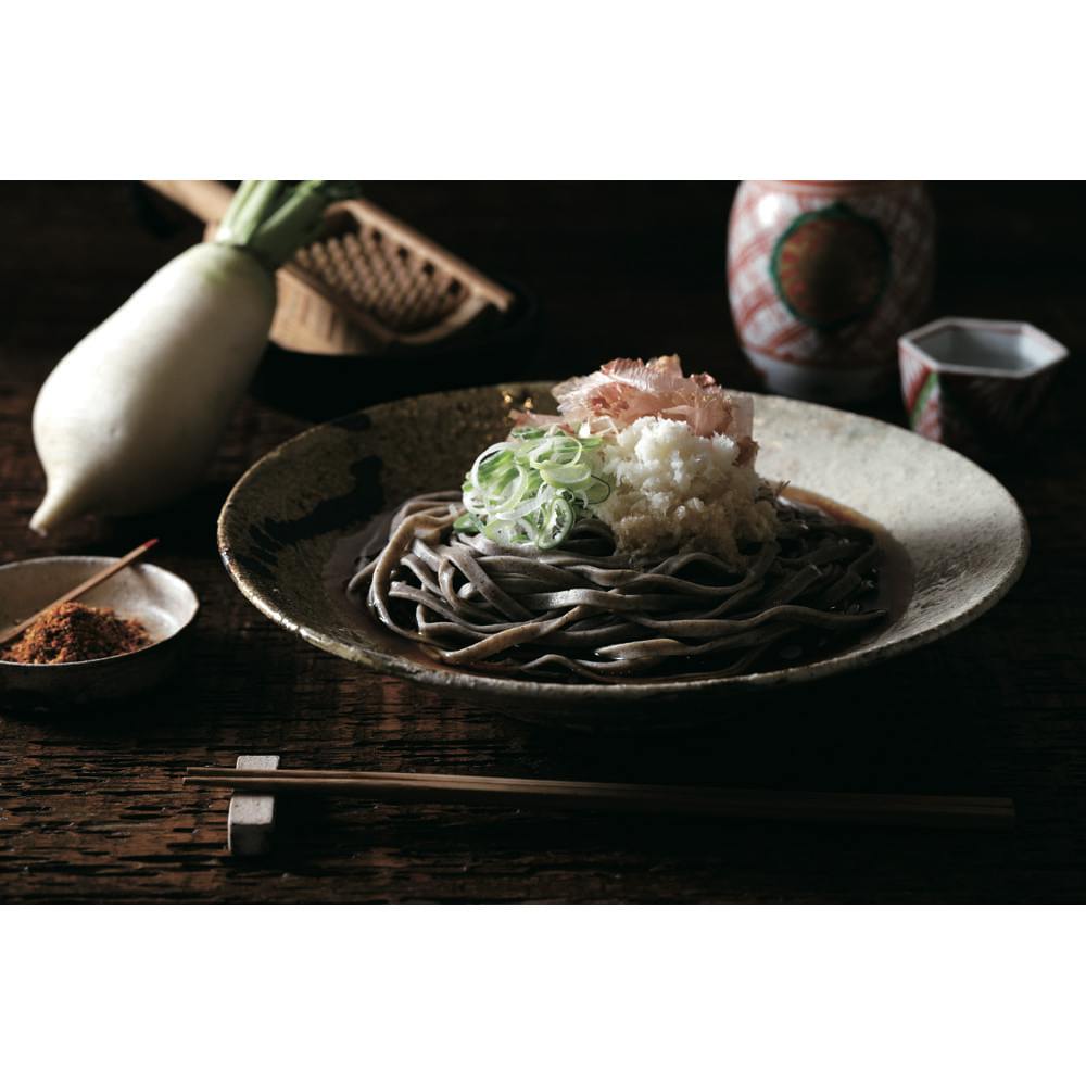 石臼挽きの福井県産自家栽培そば粉を使用し、なまそば独特の弾力のある歯ごたえと、そばの風味が際立つ極太麺の八割そばに仕上げました。鰯・鯖・鰹削り節、昆布から出汁をとった自家製つゆに、辛味大根おろし、鰹節、七味を添えれば本格「越前おろしそば」が味わえます。パッケージには、越前和紙を使った専用箱や包みには水引をあしらい、大切な方への贈り物に最適です。