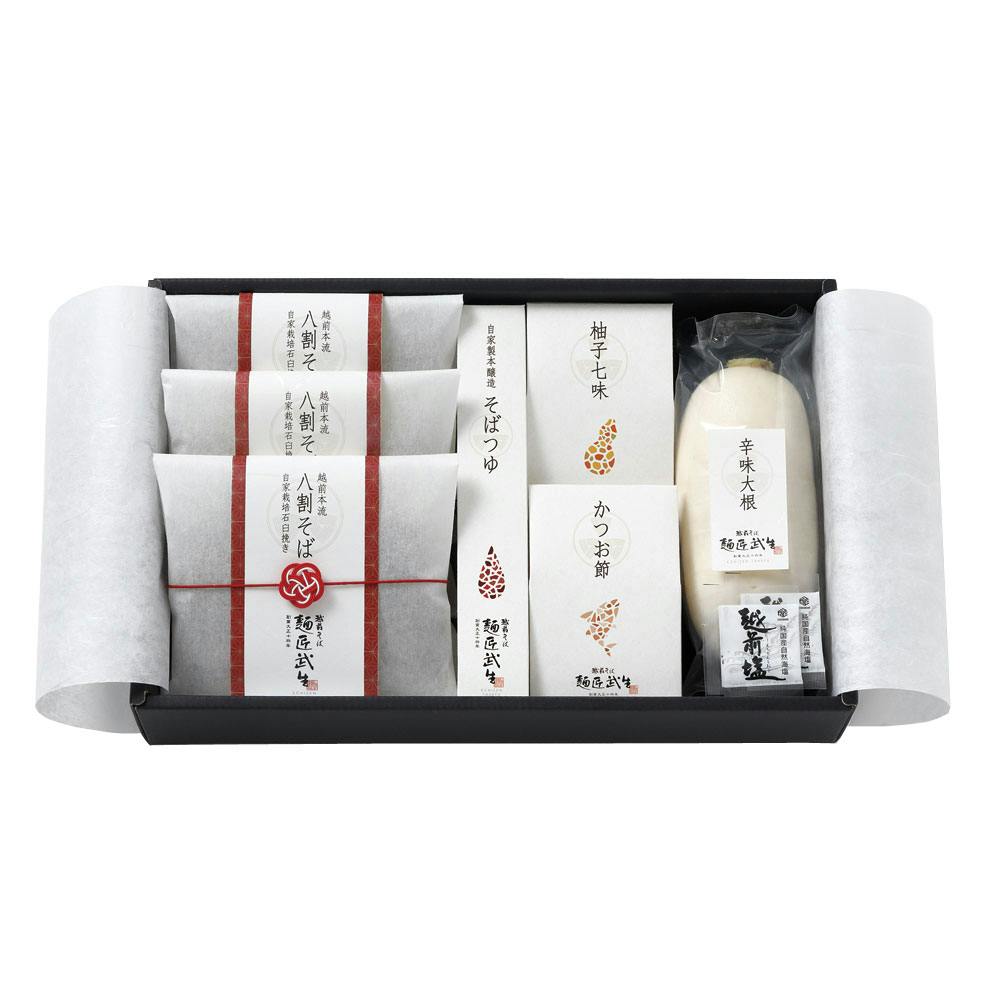 八割なまそば100g×3、そばつゆ25g×3、辛味大根1本、柚子七味5g、かつお節1g×3袋、越前塩1g×2