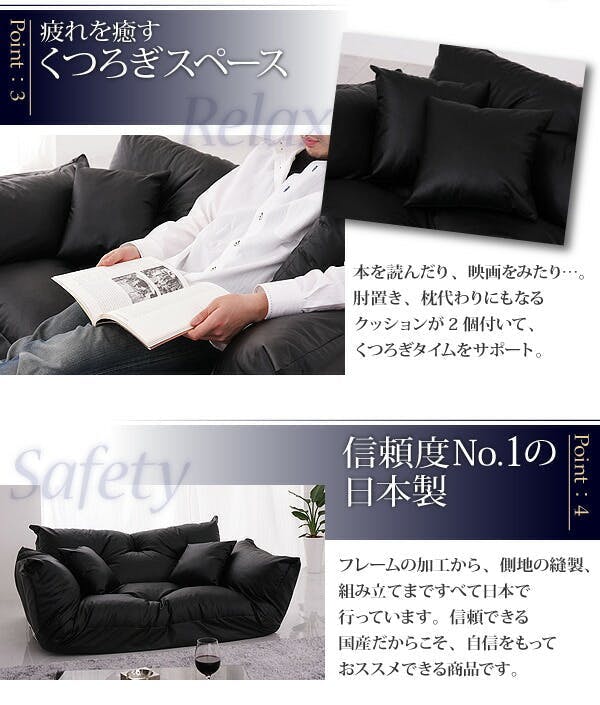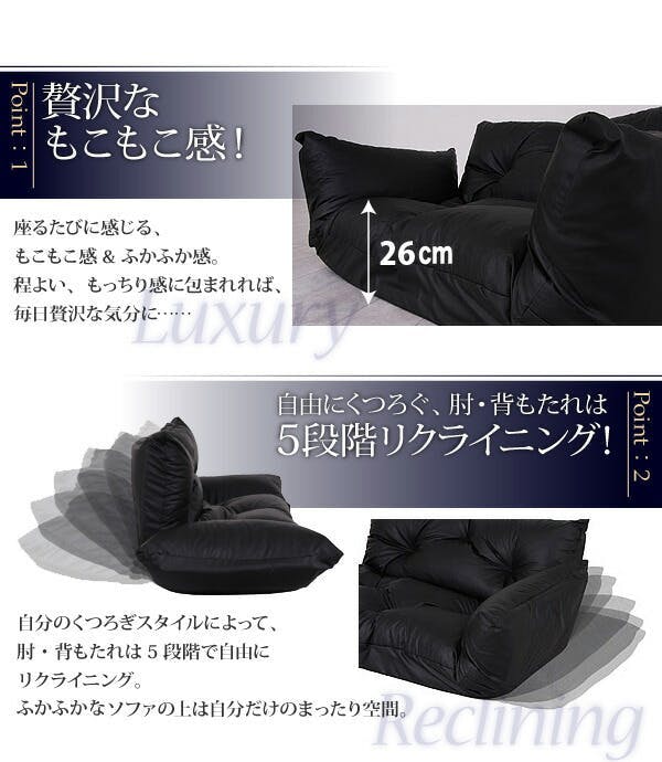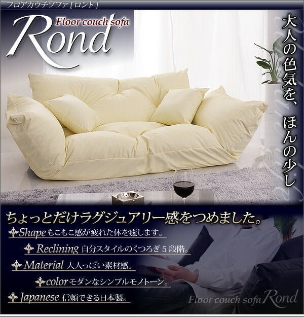 ちょっと大人の雰囲気が漂う フロアカウチソファ【Rond】ロンド ■贅沢なもこもこ感!座るたびに感じる、ふかふか感。程よい、もっちり感に包まれれば、毎日贅沢な気分に・・・■自由にくつろぐ、肘・背もたれは5段階リクライニング!自分のくつろぎスタイルによって、肘・背もたれは5段階で自由にリクライニング。映画をみたり、本を読んだり、ソファの上は自分だけのまったり空間。