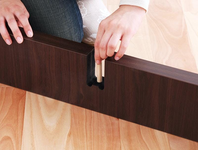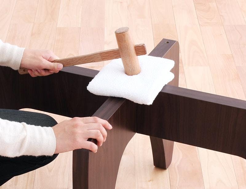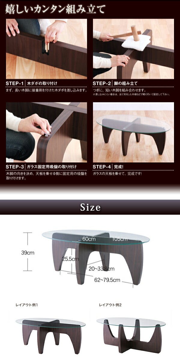 ◆Construction◆●嬉しいカンタン組み立てSTEP-1 木ダボの取り付けまず、長い木脚に接着剤を付けた木ダボを差し込みます。STEP-2 脚の組み立てつぎに、短い木脚を組み合わせます。※差し込みにくい場合は、当て布をした木槌などで軽く叩いて固定して下さい。STEP-3 ガラス固定用吸盤の取り付け木脚の向きを決め、天板を乗せる側に固定用の吸盤を取り付けます。STEP-4 完成!ガラスの天板を乗せて、完成です!